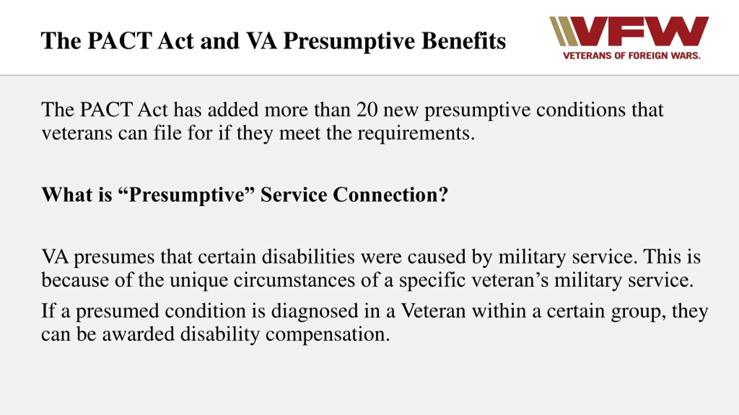 The PACT Act and VA Presumptive Benefits The PACT Act has added more than 20 new presumptive conditions that veterans can file for if they meet the requirements. What is Presumptive Service Connection? VA presumes that certain disabilities were caused by military service. This is because of the unique circumstances of a specific veteran s military service. If a presumed condition is diagnosed in a Veteran within a certain group, they can be awarded disability compensation.