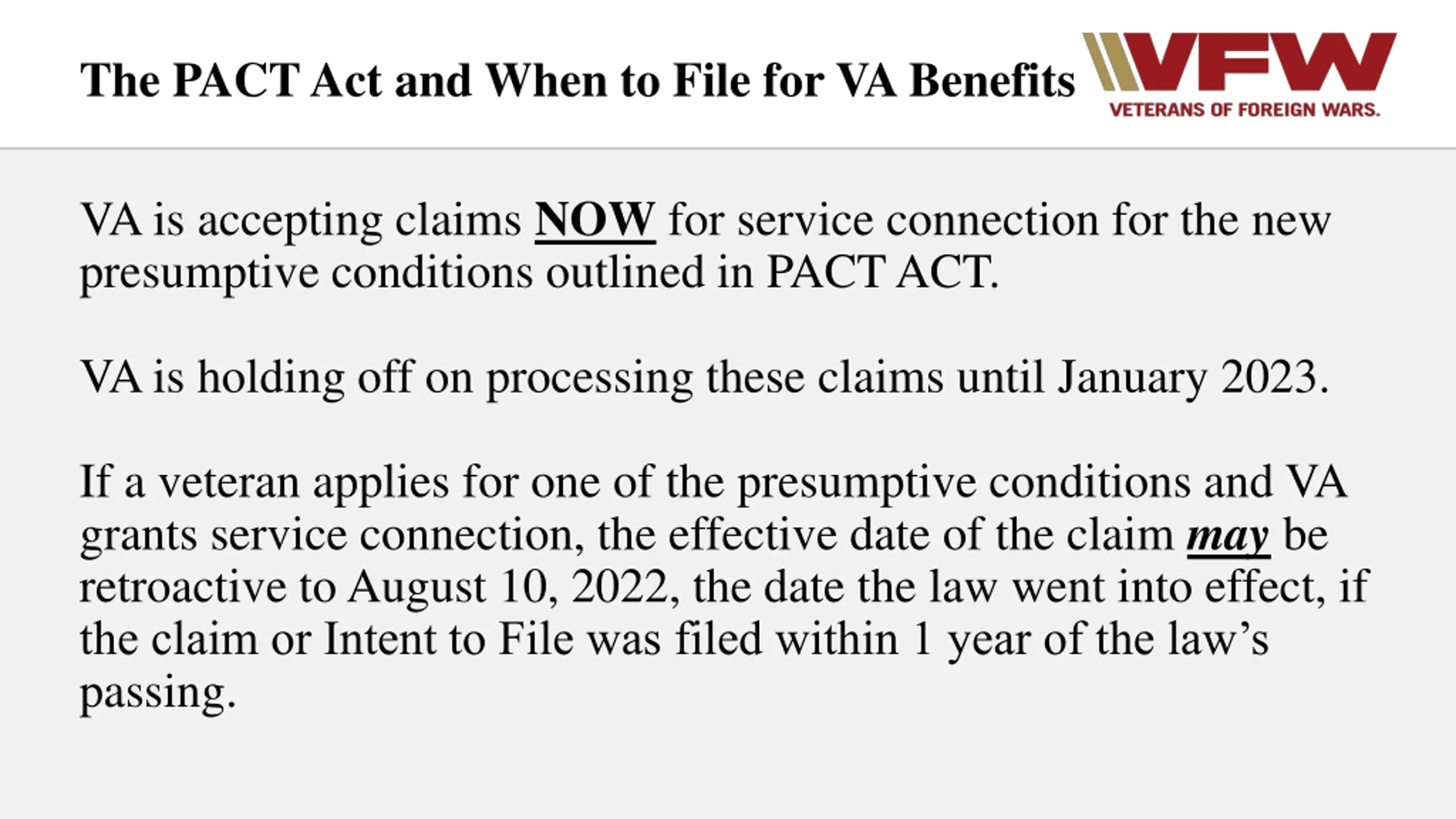 The PACT Act and When to File for VA Benefits VA is accepting claims NOW for service connection for the new presumptive conditions outlined in PACT ACT. VA is holding off on processing these claims until January 2023. If a veteran applies for one of the presumptive conditions and VA grants service connection, the effective date of the claim may be retroactive to August 10, 2022, the date the law went into effect, if the claim or Intent to File was filed within 1 year of the law s passing.