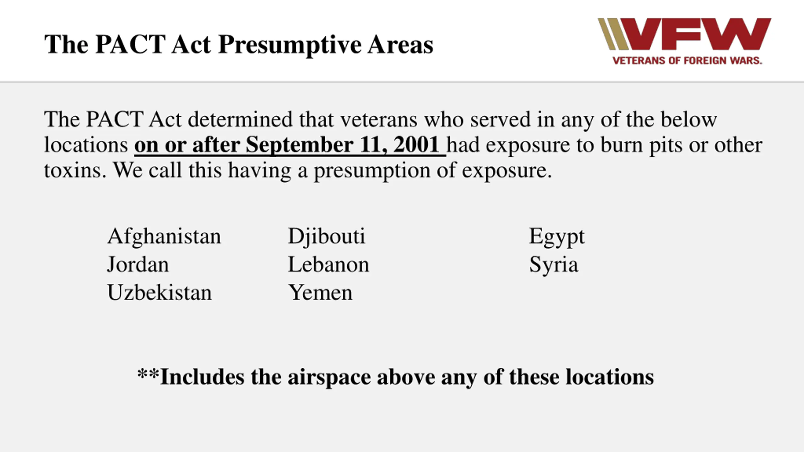 The PACT Act Presumptive Areas The PACT Act determined that veterans who served in any of the below locations on or after September 11, 2001 had exposure to burn pits or other toxins. We call this having a presumption of exposure. Afghanistan Jordan Uzbekistan Djibouti Lebanon Yemen Egypt Syria **Includes the airspace above any of these locations