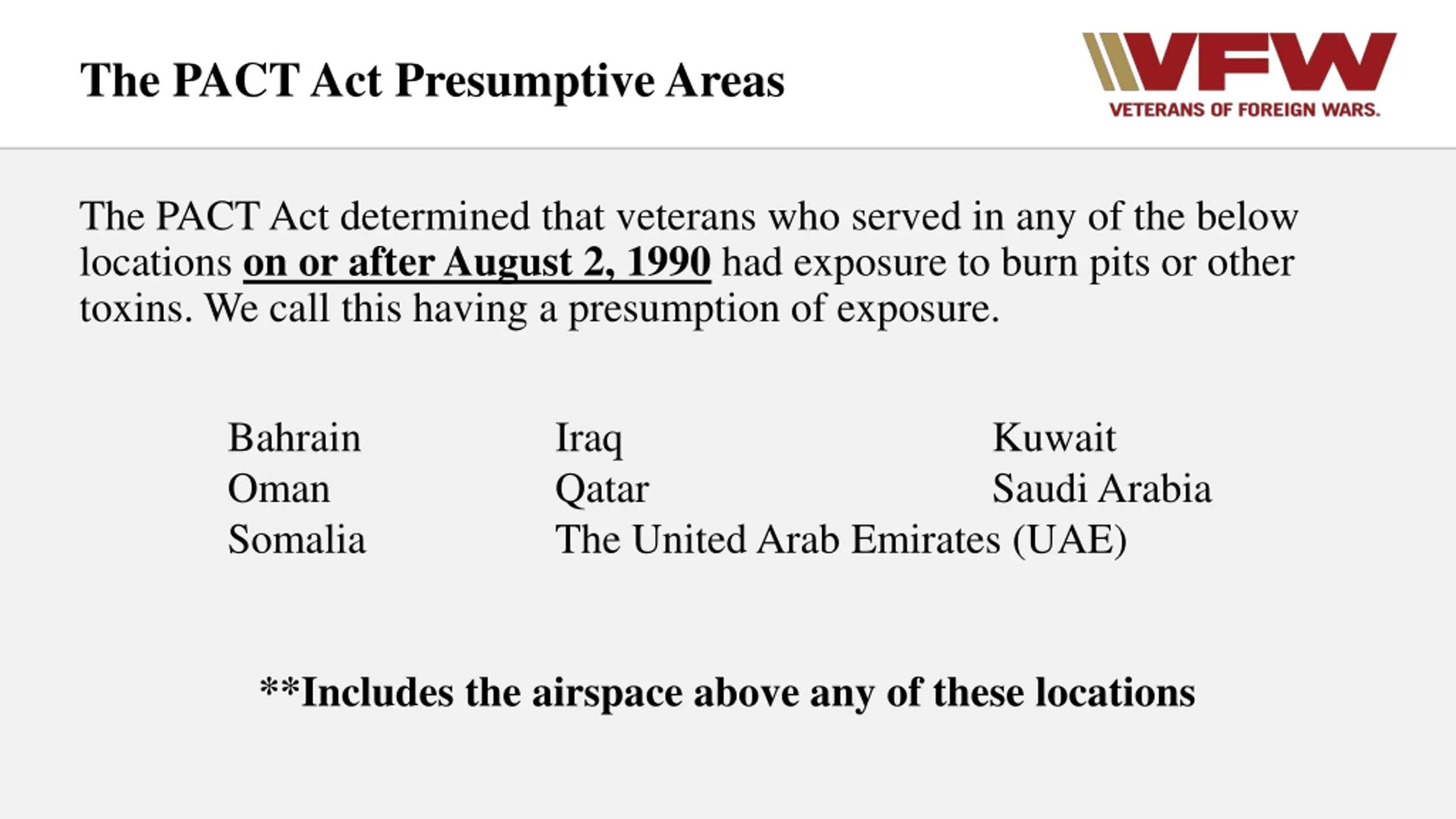 The PACT Act Presumptive Areas The PACT Act determined that veterans who served in any of the below locations on or after August 2, 1990 had exposure to burn pits or other toxins. We call this having a presumption of exposure. Bahrain Oman Somalia Iraq Qatar The United Arab Emirates (UAE) Kuwait Saudi Arabia **Includes the airspace above any of these locations