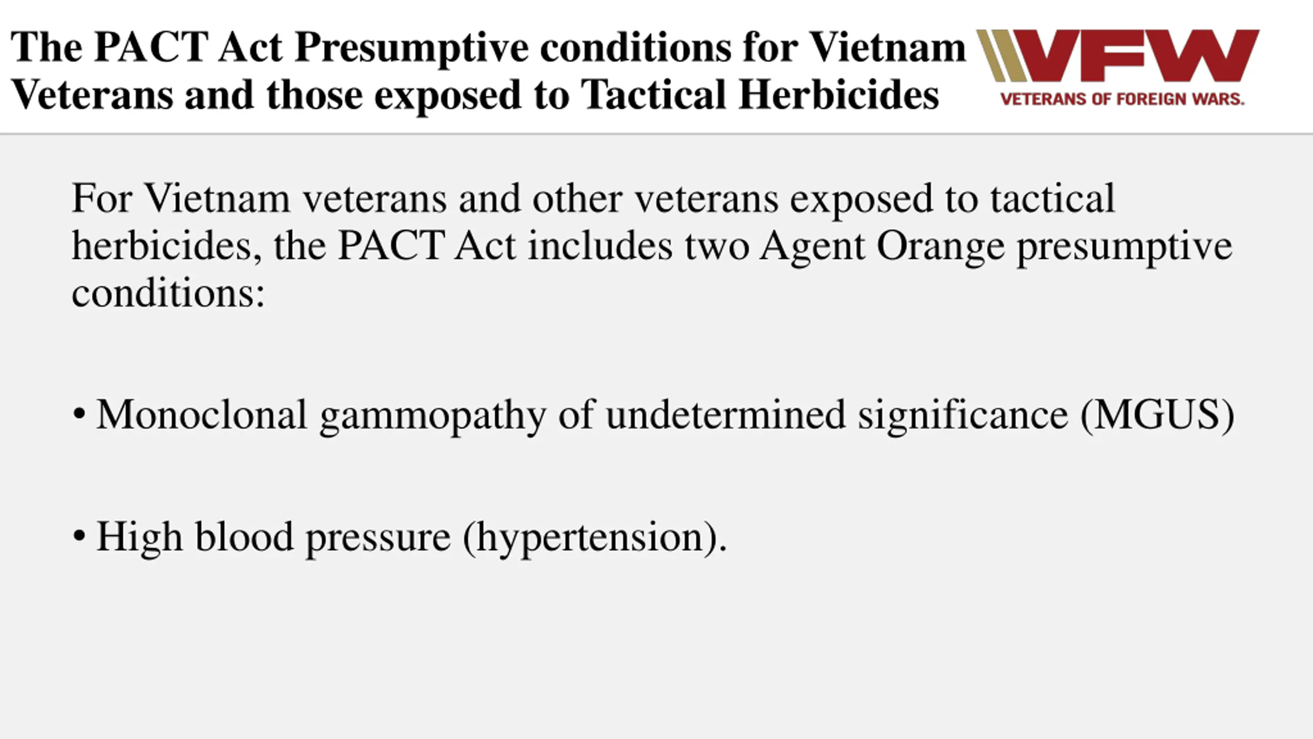 The PACT Act Presumptive conditions for Vietnam Veterans and those exposed to Tactical Herbicides For Vietnam veterans and other veterans exposed to tactical herbicides, the PACT Act includes two Agent Orange presumptive conditions: Monoclonal gammopathy of undetermined significance (MGUS) High blood pressure (hypertension).