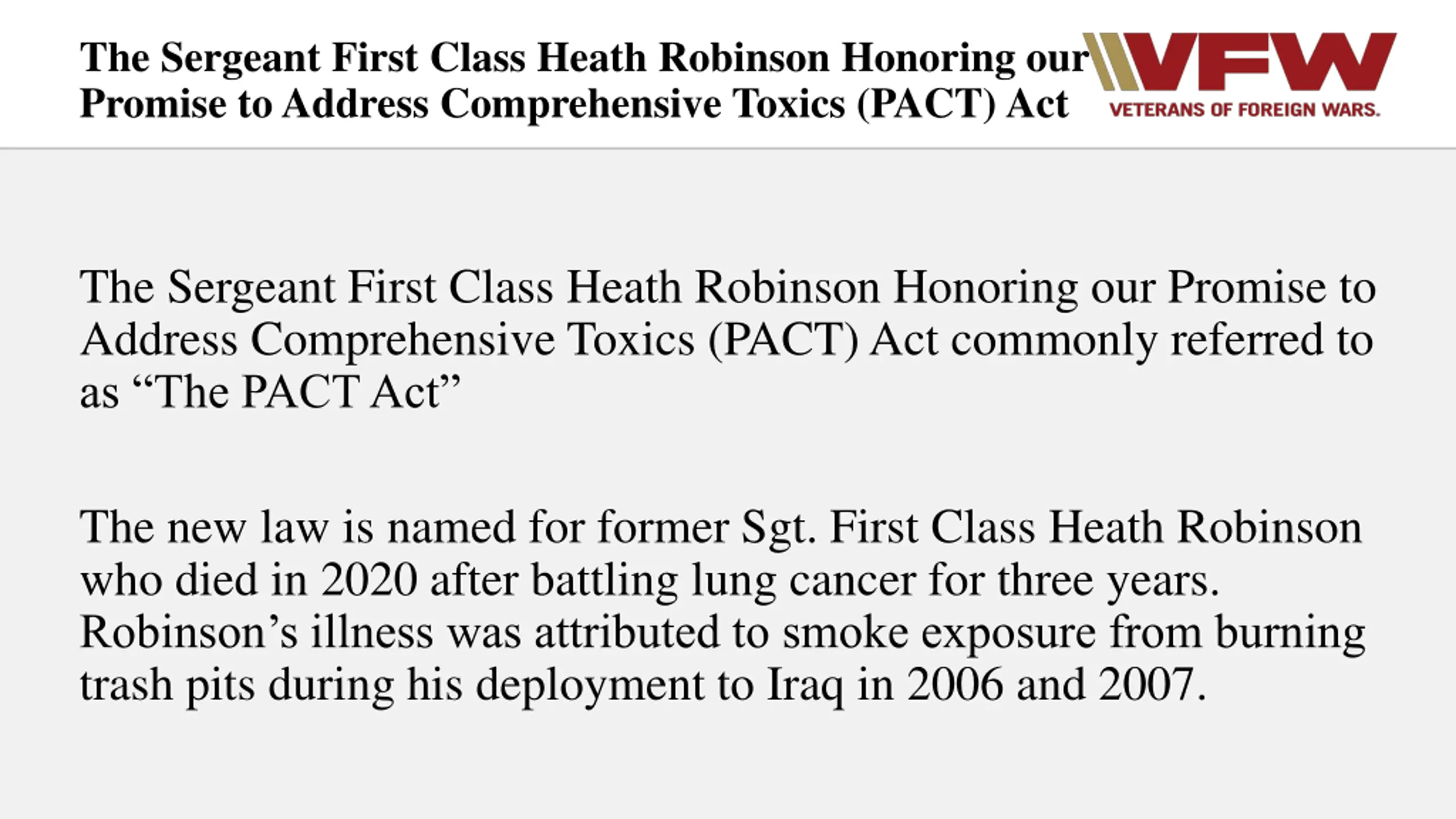 The Sergeant First Class Heath Robinson Honoring our Promise to Address Comprehensive Toxics (PACT) Act The Sergeant First Class Heath Robinson Honoring our Promise to Address Comprehensive Toxics (PACT) Act commonly referred to as The PACT Act The new law is named for former Sgt. First Class Heath Robinson who died in 2020 after battling lung cancer for three years. Robinson s illness was attributed to smoke exposure from burning trash pits during his deployment to Iraq in 2006 and 2007.
