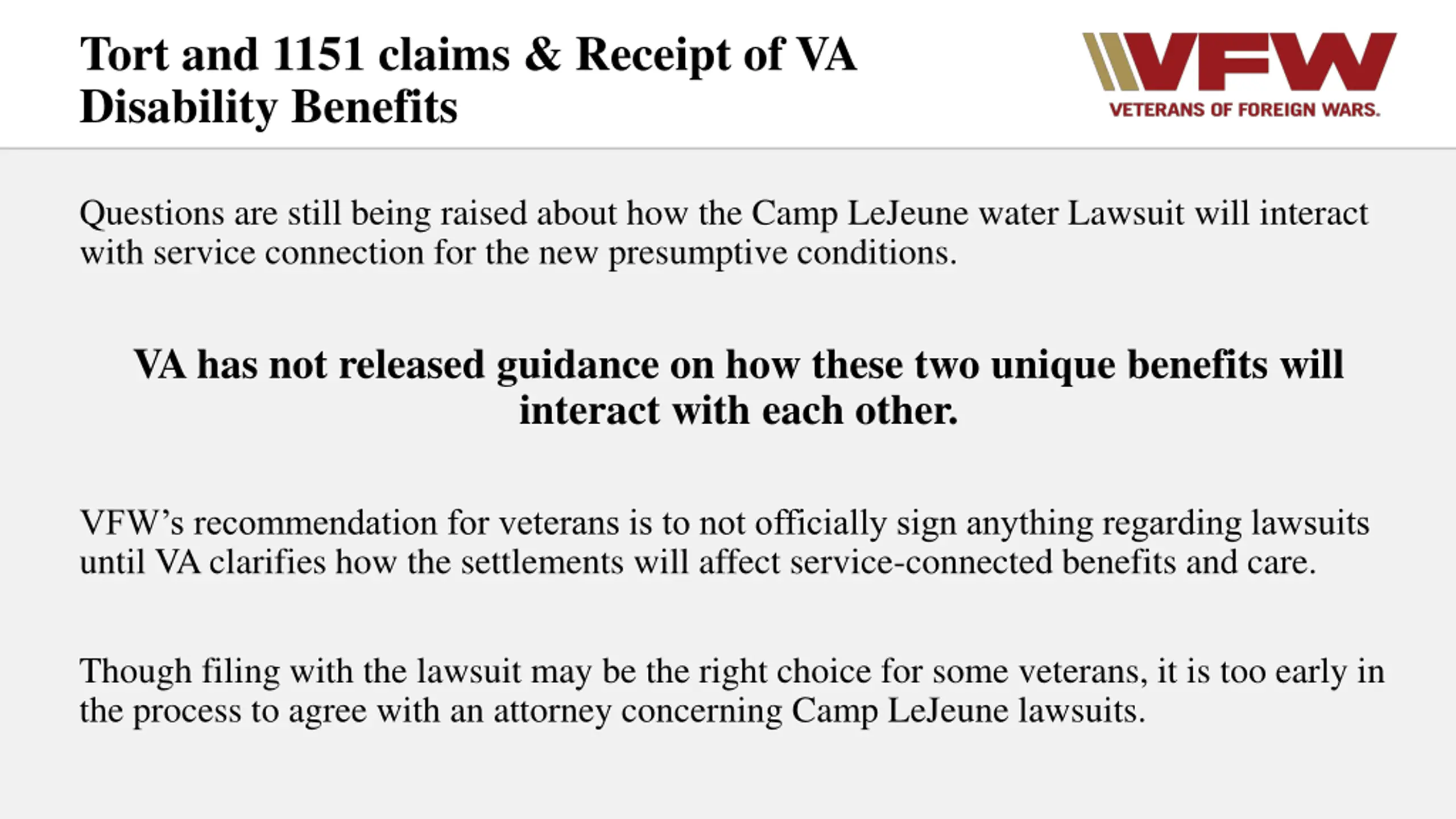 Tort and 1151 claims & Receipt of VA Disability Benefits Questions are still being raised about how the Camp LeJeune water Lawsuit will interact with service connection for the new presumptive conditions. VA has not released guidance on how these two unique benefits will interact with each other. VFW s recommendation for veterans is to not officially sign anything regarding lawsuits until VA clarifies how the settlements will affect service-connected benefits and care. Though filing with the lawsuit may be the right choice for some veterans, it is too early in the process to agree with an attorney concerning Camp LeJeune lawsuits.