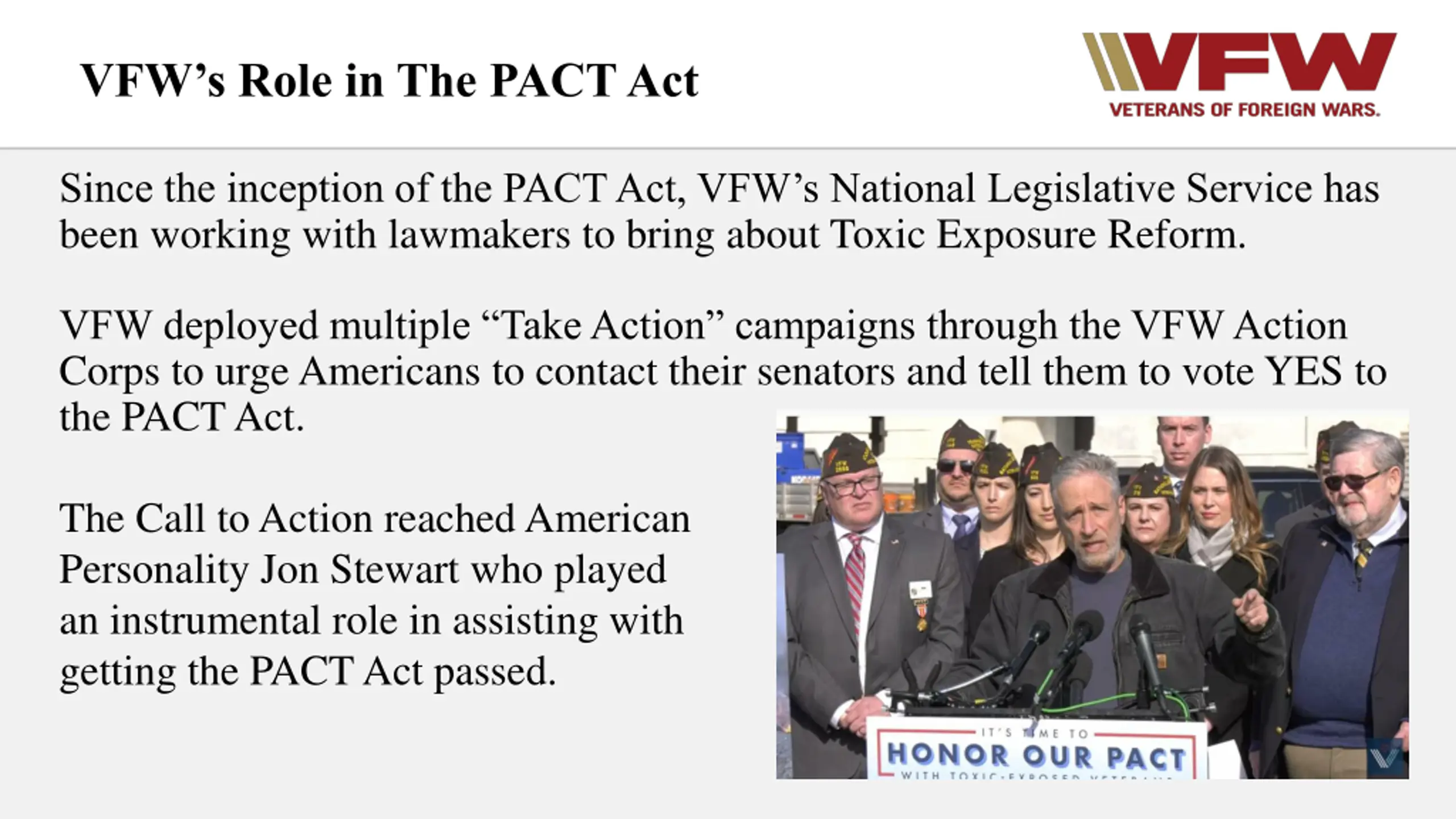 VFWs Role in The PACT Act Since the inception of the PACT Act, VFW s National Legislative Service has been working with lawmakers to bring about Toxic Exposure Reform. VFW deployed multiple Take Action campaigns through the VFW Action Corps to urge Americans to contact their senators and tell them to vote YES to the PACT Act. The Call to Action reached American Personality Jon Stewart who played an instrumental role in assisting with getting the PACT Act passed.
