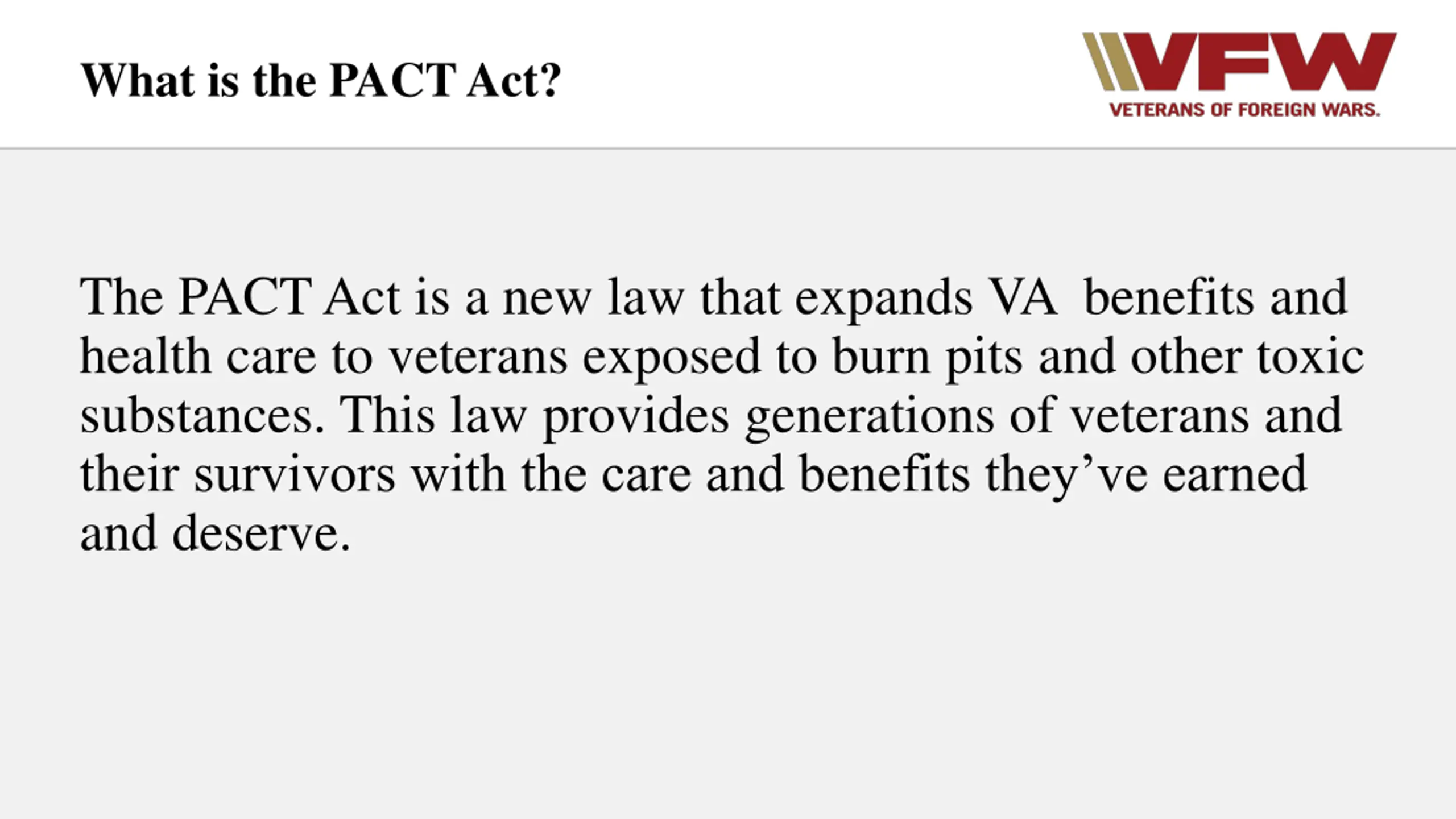 What is the PACT Act? The PACT Act is a new law that expands VA benefits and health care to veterans exposed to burn pits and other toxic substances. This law provides generations of veterans and their survivors with the care and benefits they ve earned and deserve.