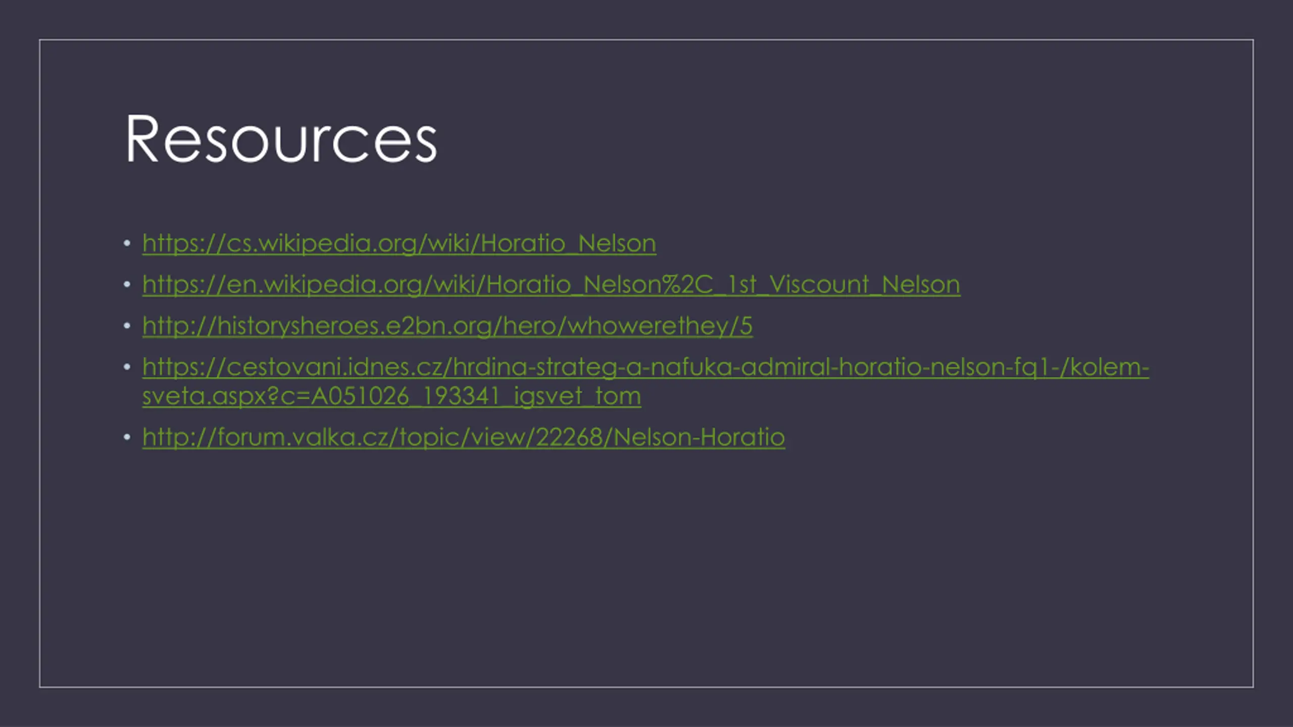 Resources https://cs.wikipedia.org/wiki/Horatio_Nelson https://en.wikipedia.org/wiki/Horatio_Nelson%2C_1st_Viscount_Nelson http://historysheroes.e2bn.org/hero/whowerethey/5 https://cestovani.idnes.cz/hrdina-strateg-a-nafuka-admiral-horatio-nelson-fq1-/kolem- sveta.aspx?c=A051026_193341_igsvet_tom http://forum.valka.cz/topic/view/22268/Nelson-Horatio