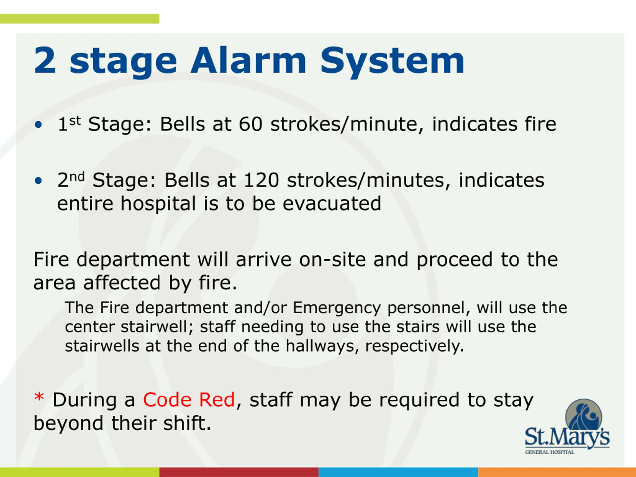 2 stage Alarm System 1st Stage: Bells at 60 strokes/minute, indicates fire 2nd Stage: Bells at 120 strokes/minutes, indicates entire hospital is to be evacuated Fire department will arrive on-site and proceed to the area affected by fire. The Fire department and/or Emergency personnel, will use the center stairwell; staff needing to use the stairs will use the stairwells at the end of the hallways, respectively. * During a Code Red, staff may be required to stay beyond their shift.