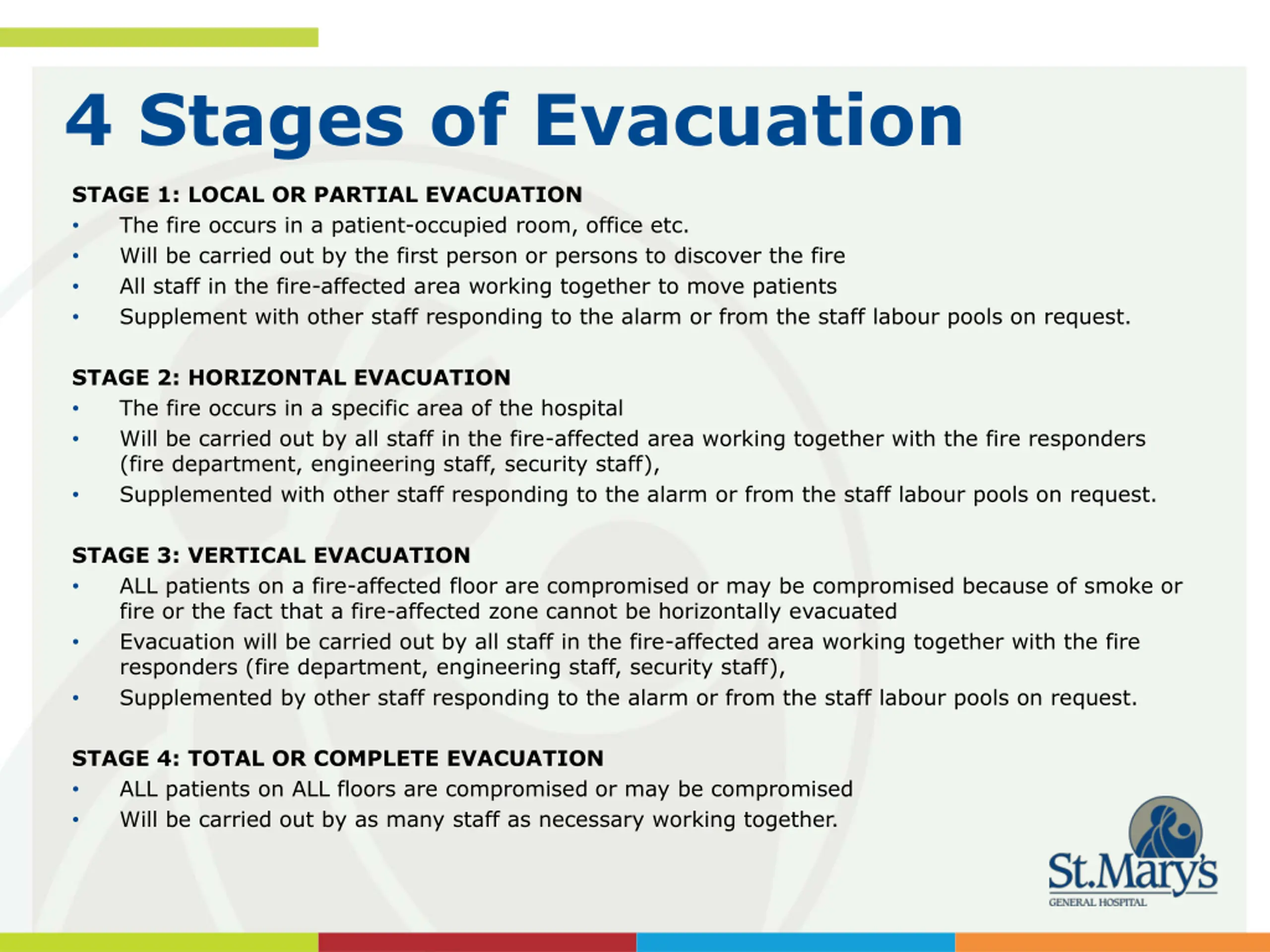 4 Stages of Evacuation STAGE 1: LOCAL OR PARTIAL EVACUATION The fire occurs in a patient-occupied room, office etc. Will be carried out by the first person or persons to discover the fire All staff in the fire-affected area working together to move patients Supplement with other staff responding to the alarm or from the staff labour pools on request. STAGE 2: HORIZONTAL EVACUATION The fire occurs in a specific area of the hospital Will be carried out by all staff in the fire-affected area working together with the fire responders (fire department, engineering staff, security staff), Supplemented with other staff responding to the alarm or from the staff labour pools on request. STAGE 3: VERTICAL EVACUATION ALL patients on a fire-affected floor are compromised or may be compromised because of smoke or fire or the fact that a fire-affected zone cannot be horizontally evacuated Evacuation will be carried out by all staff in the fire-affected area working together with the fire responders (fire department, engineering staff, security staff), Supplemented by other staff responding to the alarm or from the staff labour pools on request. STAGE 4: TOTAL OR COMPLETE EVACUATION ALL patients on ALL floors are compromised or may be compromised Will be carried out by as many staff as necessary working together.