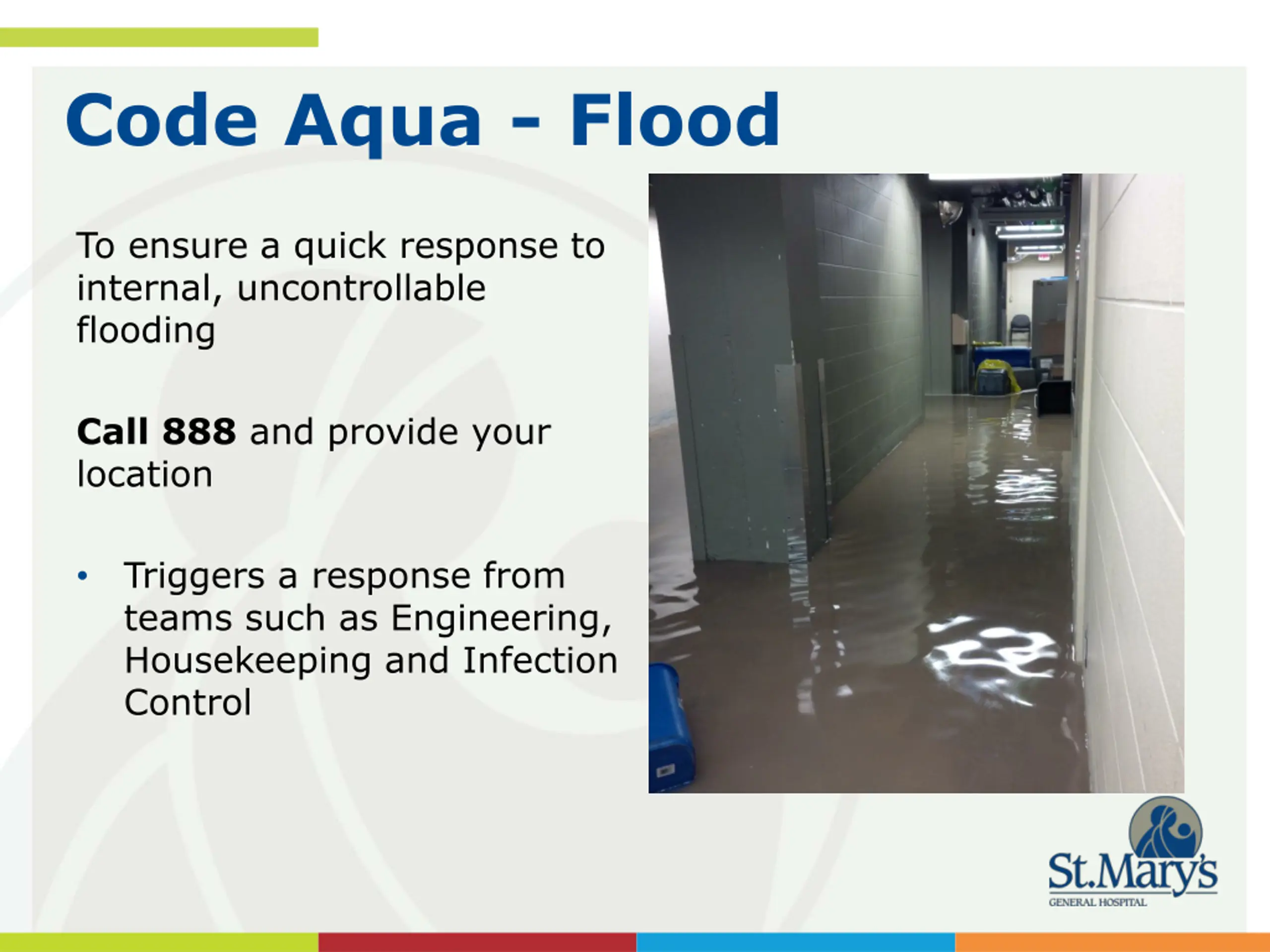 Code Aqua - Flood To ensure a quick response to internal, uncontrollable flooding Call 888 and provide your location Triggers a response from teams such as Engineering, Housekeeping and Infection Control