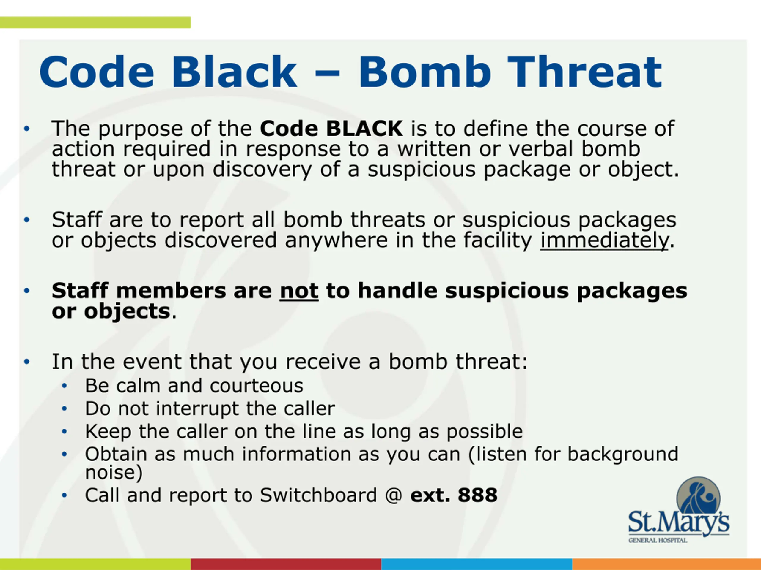 Code Black Bomb Threat The purpose of the Code BLACK is to define the course of action required in response to a written or verbal bomb threat or upon discovery of a suspicious package or object. Staff are to report all bomb threats or suspicious packages or objects discovered anywhere in the facility immediately. Staff members are not to handle suspicious packages or objects. In the event that you receive a bomb threat: Be calm and courteous Do not interrupt the caller Keep the caller on the line as long as possible Obtain as much information as you can (listen for background noise) Call and report to Switchboard @ ext. 888