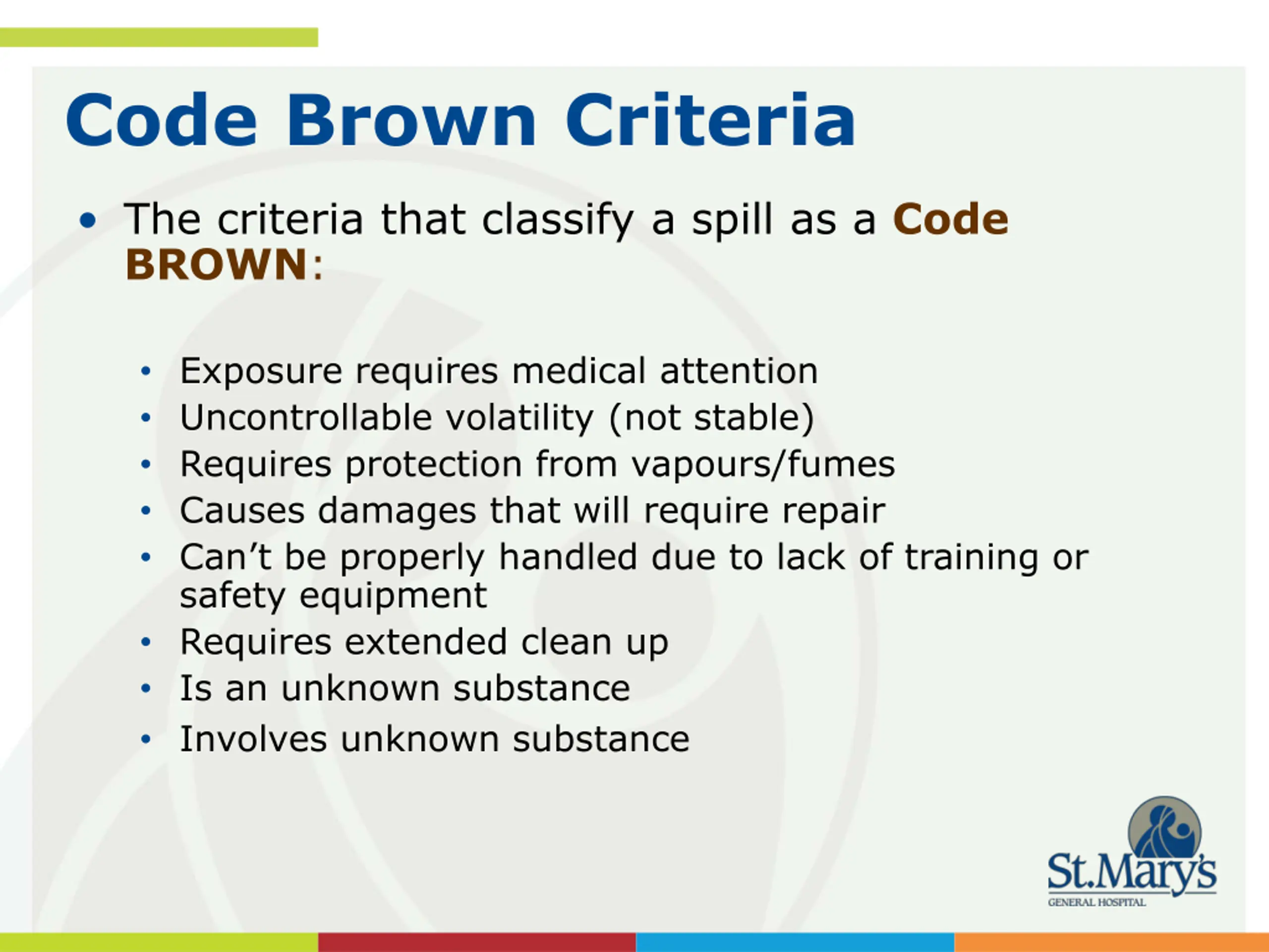 Code Brown Criteria The criteria that classify a spill as a Code BROWN: Exposure requires medical attention Uncontrollable volatility (not stable) Requires protection from vapours/fumes Causes damages that will require repair Can t be properly handled due to lack of training or safety equipment Requires extended clean up Is an unknown substance Involves unknown substance
