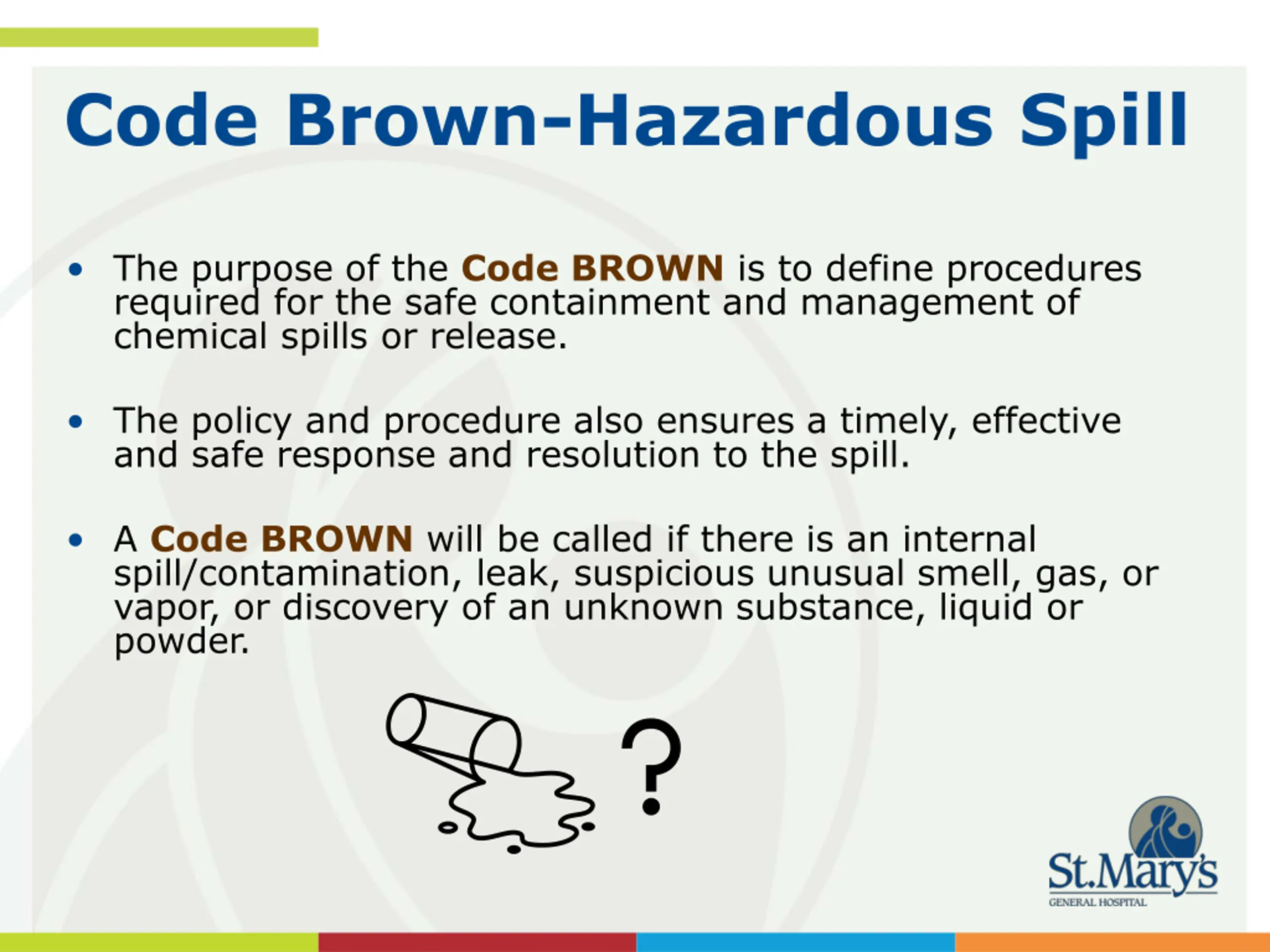 Code Brown-Hazardous Spill The purpose of the Code BROWN is to define procedures required for the safe containment and management of chemical spills or release. The policy and procedure also ensures a timely, effective and safe response and resolution to the spill. A Code BROWN will be called if there is an internal spill/contamination, leak, suspicious unusual smell, gas, or vapor, or discovery of an unknown substance, liquid or powder.