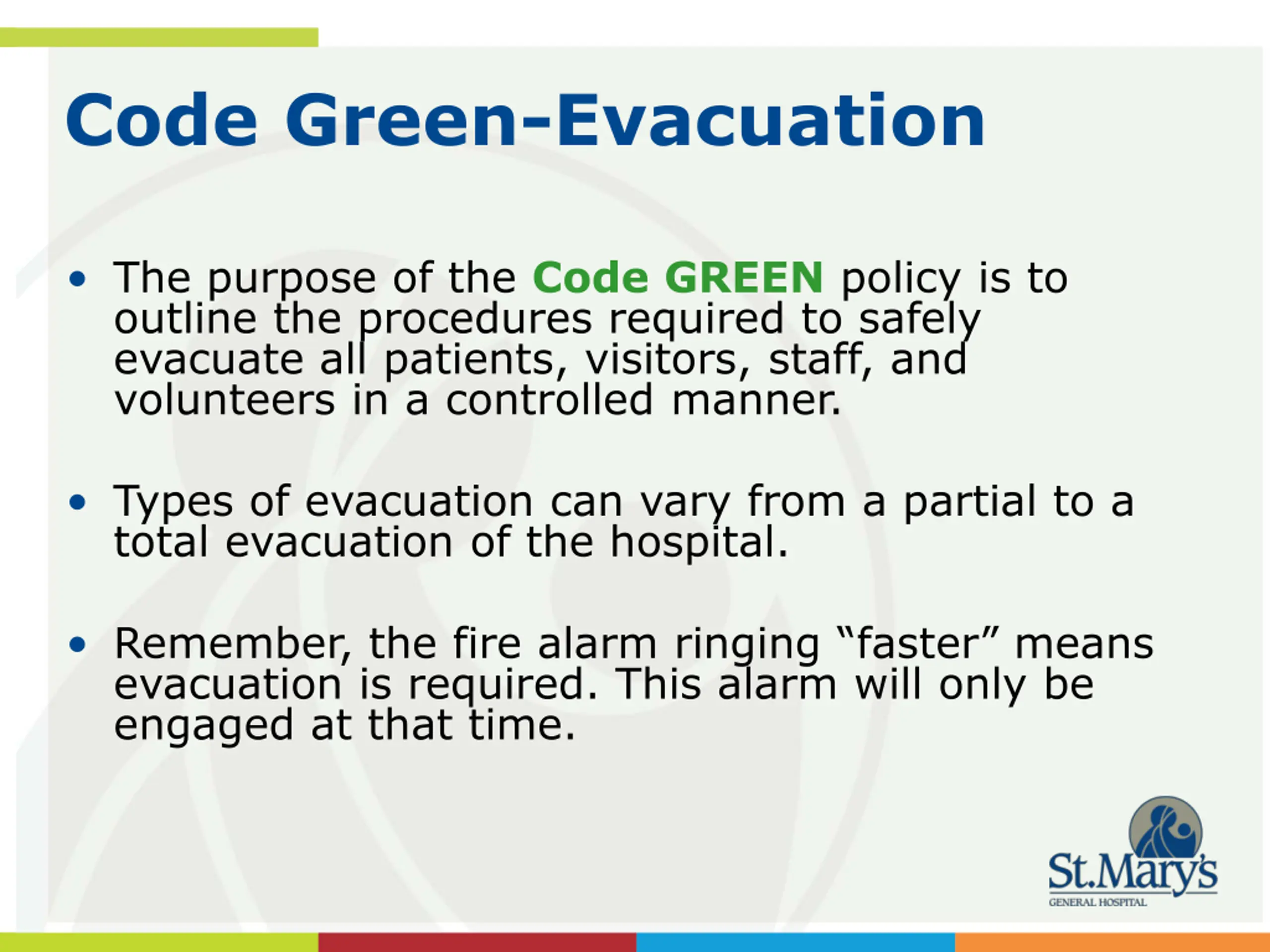 Code Green-Evacuation The purpose of the Code GREEN policy is to outline the procedures required to safely evacuate all patients, visitors, staff, and volunteers in a controlled manner. Types of evacuation can vary from a partial to a total evacuation of the hospital. Remember, the fire alarm ringing faster means evacuation is required. This alarm will only be engaged at that time.