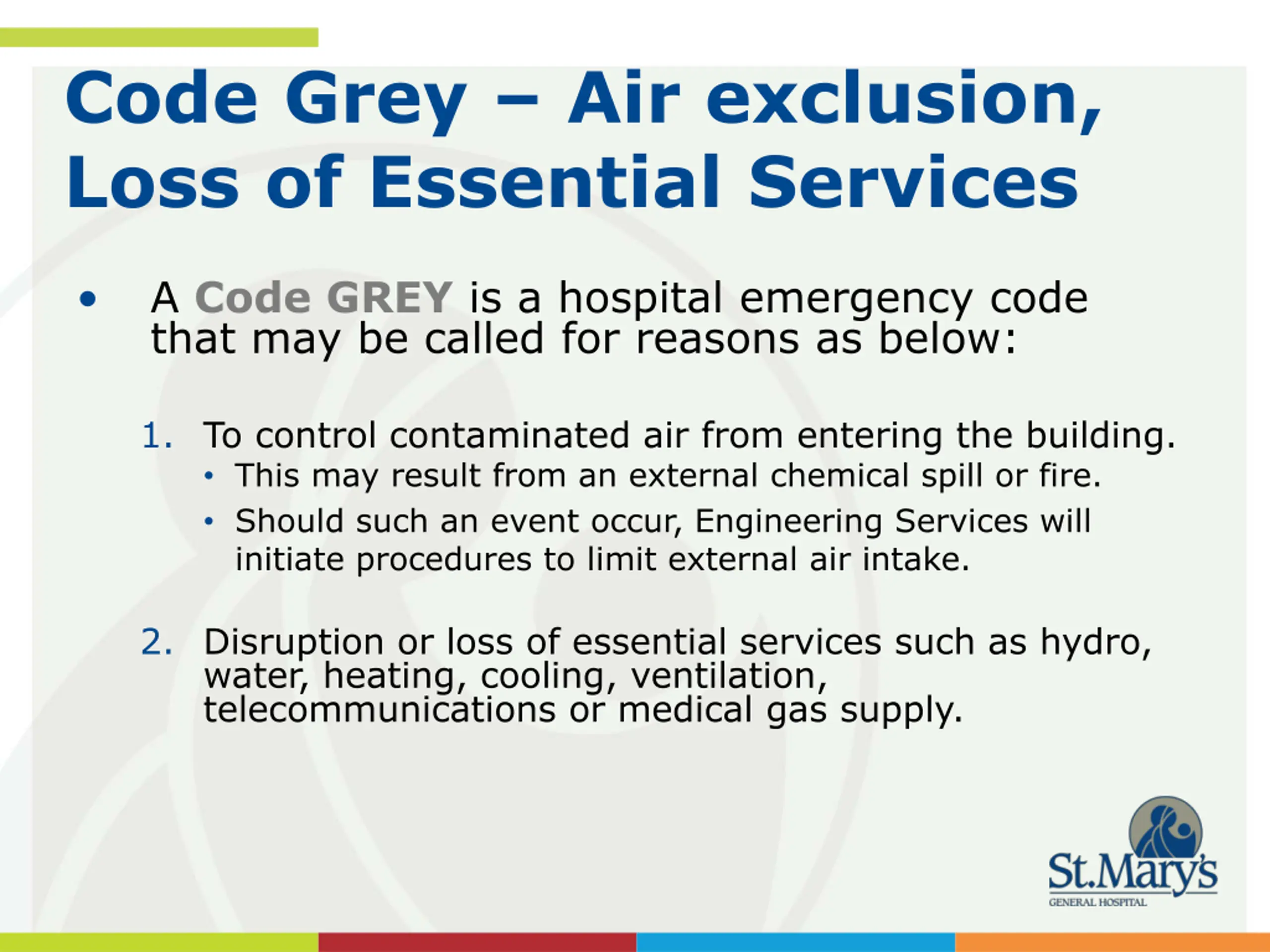Code Grey Air exclusion, Loss of Essential Services A Code GREY is a hospital emergency code that may be called for reasons as below: 1. To control contaminated air from entering the building. This may result from an external chemical spill or fire. Should such an event occur, Engineering Services will initiate procedures to limit external air intake. 2. Disruption or loss of essential services such as hydro, water, heating, cooling, ventilation, telecommunications or medical gas supply.