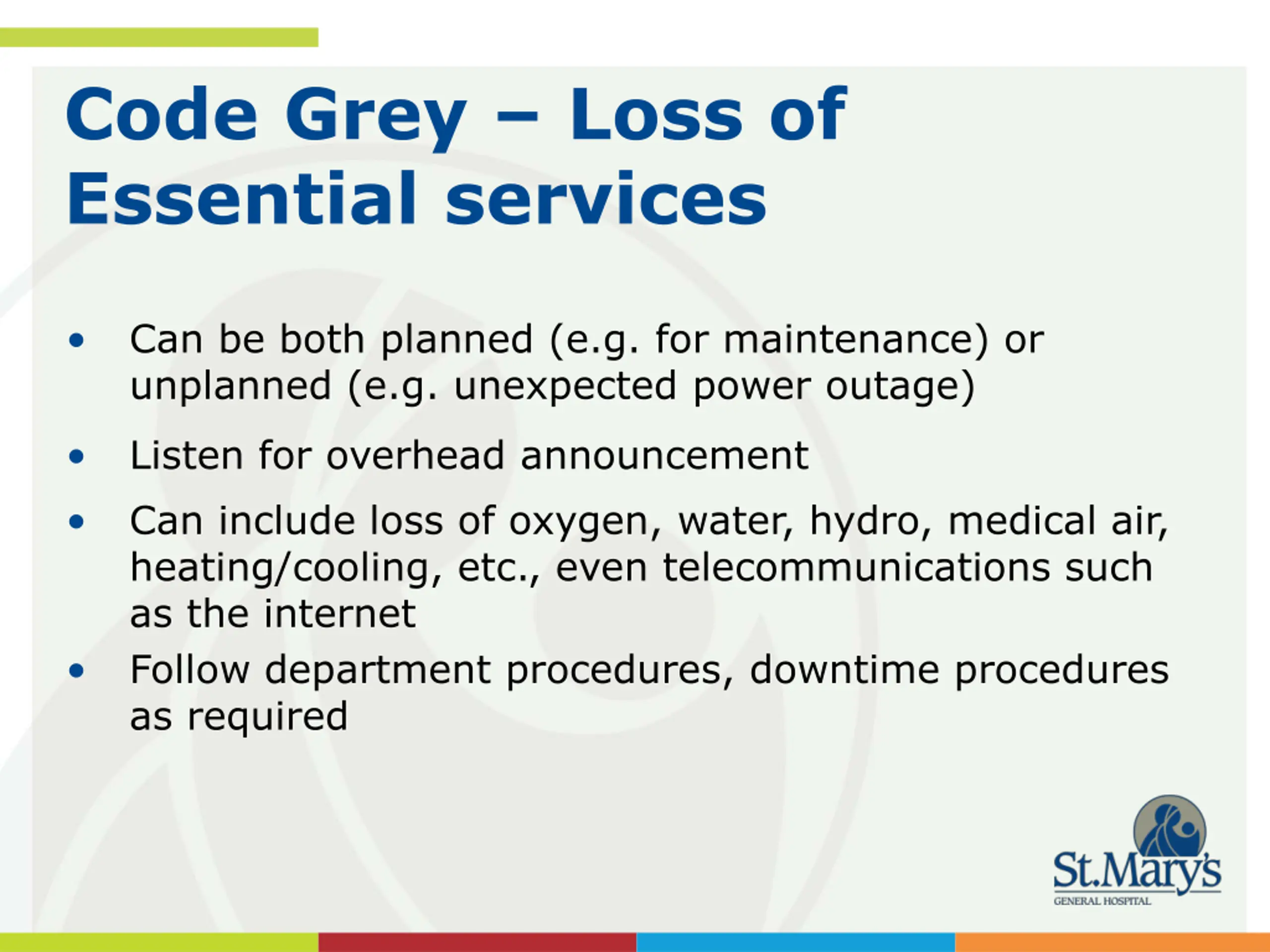 Code Grey Loss of Essential services Can be both planned (e.g. for maintenance) or unplanned (e.g. unexpected power outage) Listen for overhead announcement Can include loss of oxygen, water, hydro, medical air, heating/cooling, etc., even telecommunications such as the internet Follow department procedures, downtime procedures as required