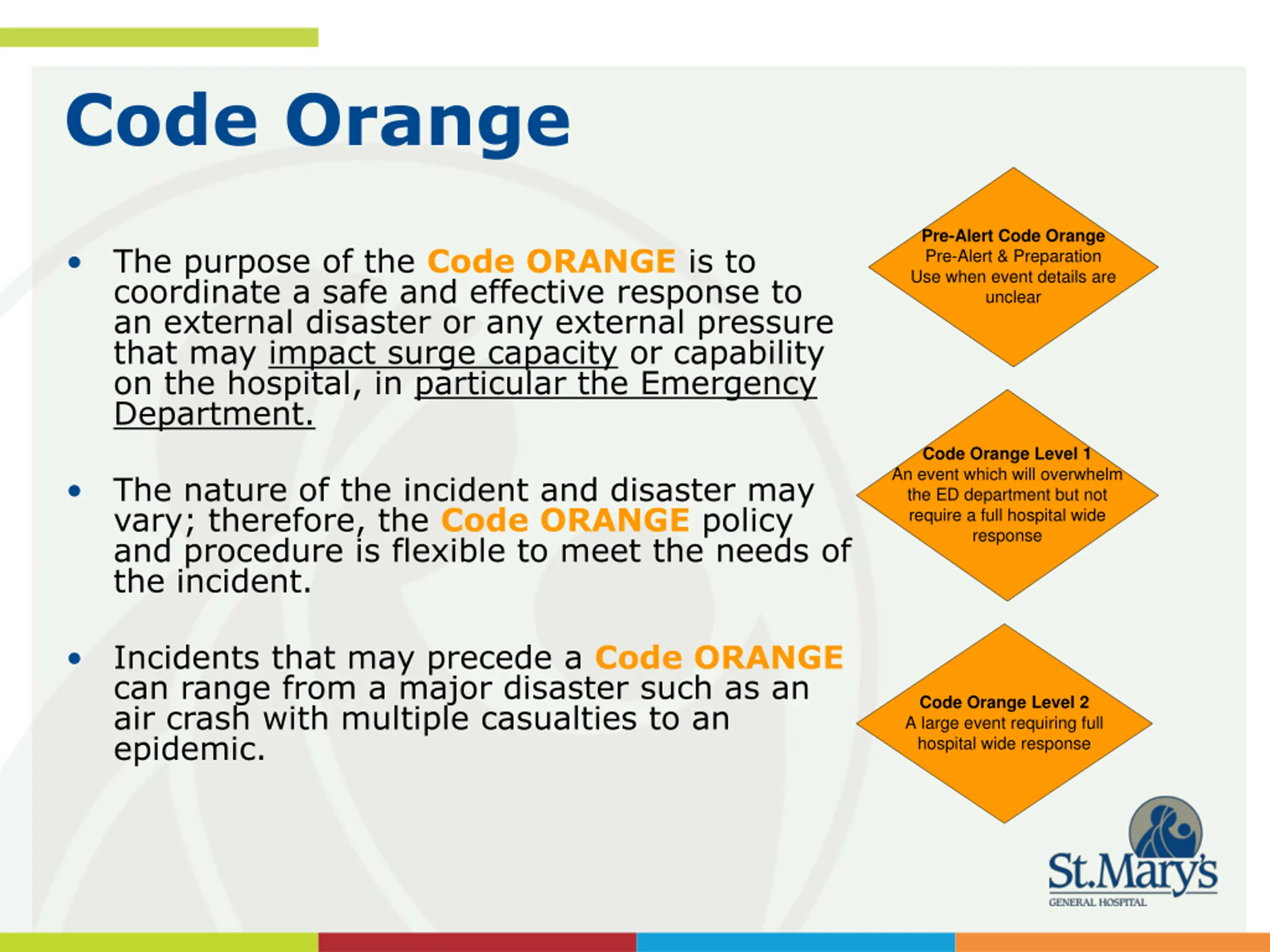 Code Orange Pre-Alert Code Orange Pre-Alert & Preparation Use when event details are unclear The purpose of the Code ORANGE is to coordinate a safe and effective response to an external disaster or any external pressure that may impact surge capacity or capability on the hospital, in particular the Emergency Department. Code Orange Level 1 An event which will overwhelm the ED department but not require a full hospital wide response The nature of the incident and disaster may vary; therefore, the Code ORANGE policy and procedure is flexible to meet the needs of the incident. Incidents that may precede a Code ORANGE can range from a major disaster such as an air crash with multiple casualties to an epidemic. Code Orange Level 2 A large event requiring full hospital wide response