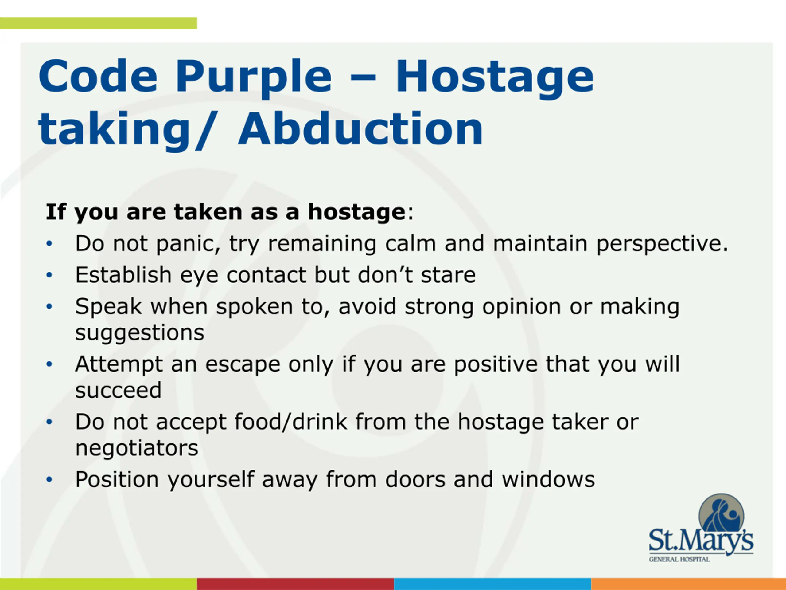 Code Purple Hostage taking/ Abduction Ifyou are taken as a hostage: Do not panic, try remaining calm and maintain perspective. Establish eye contact but don t stare Speak when spoken to, avoid strong opinion or making suggestions Attempt an escape only if you are positive that you will succeed Do not accept food/drink from the hostage taker or negotiators Position yourself away from doors and windows