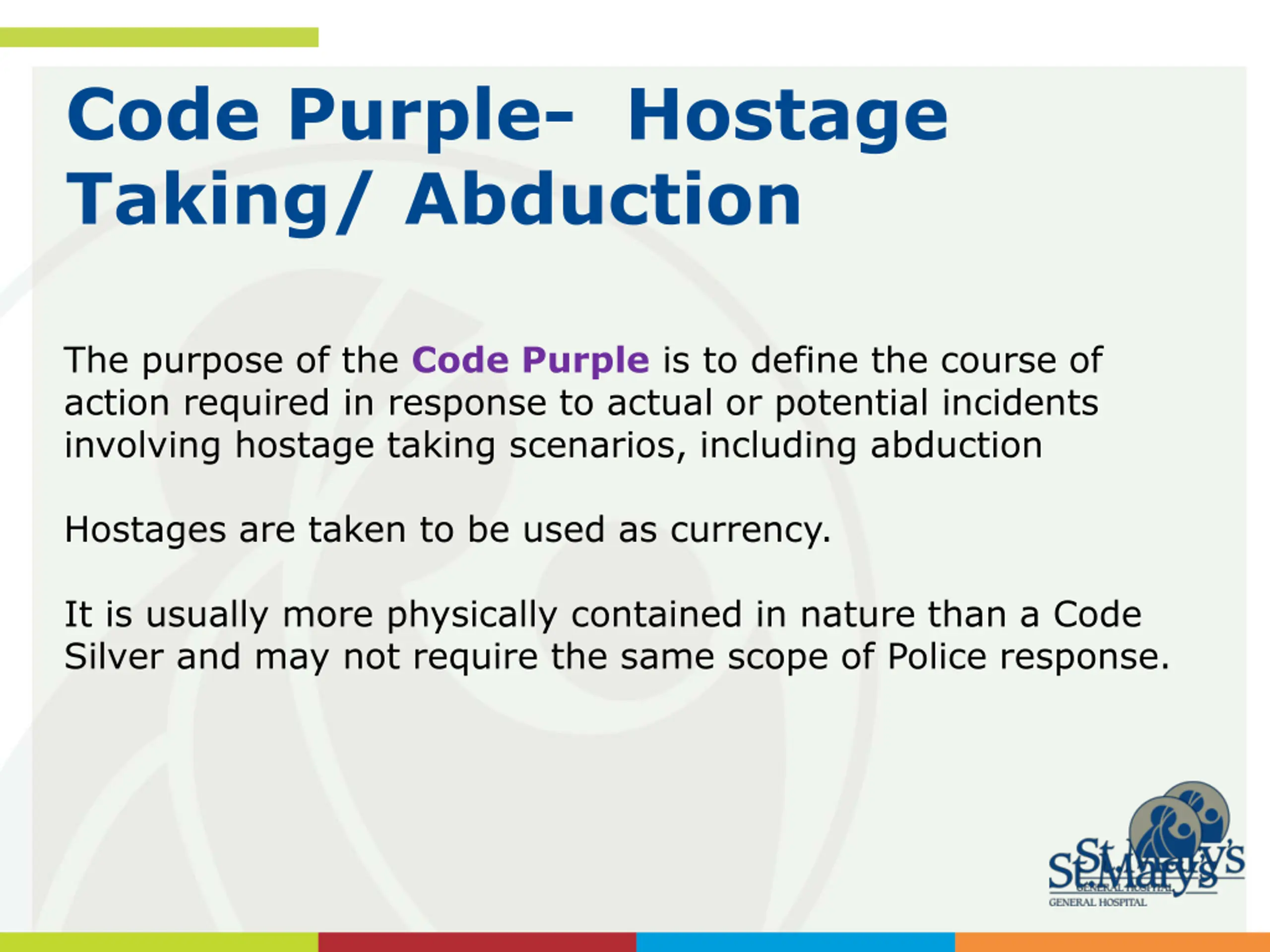 Code Purple- Hostage Taking/ Abduction The purpose of the Code Purple is to define the course of action required in response to actual or potential incidents involving hostage taking scenarios, including abduction Hostages are taken to be used as currency. It is usually more physically contained in nature than a Code Silver and may not require the same scope of Police response.