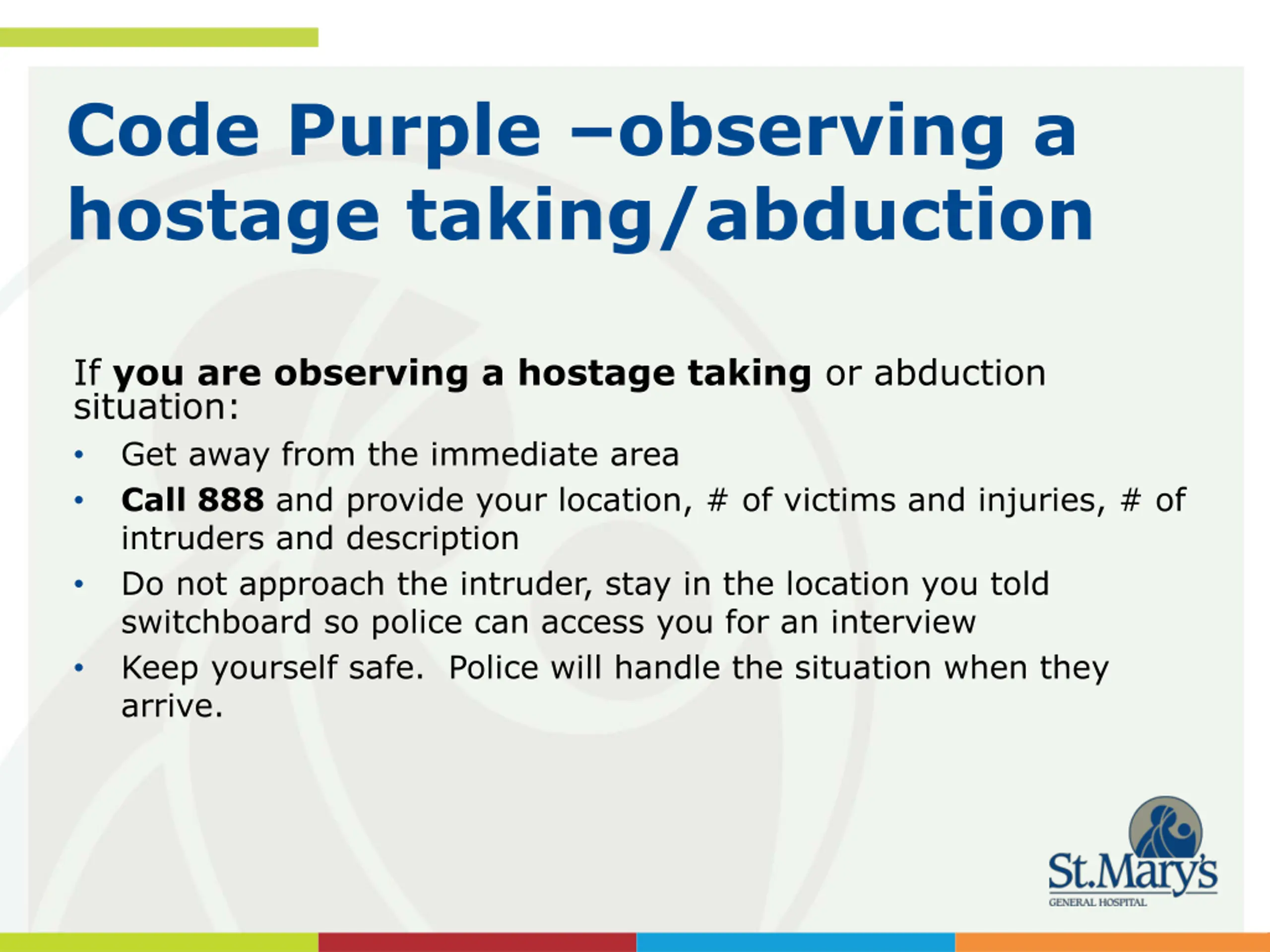Code Purple observing a hostage taking/abduction If you are observing a hostage taking or abduction situation: Get away from the immediate area Call 888 and provide your location, # of victims and injuries, # of intruders and description Do not approach the intruder, stay in the location you told switchboard so police can access you for an interview Keep yourself safe. Police will handle the situation when they arrive.