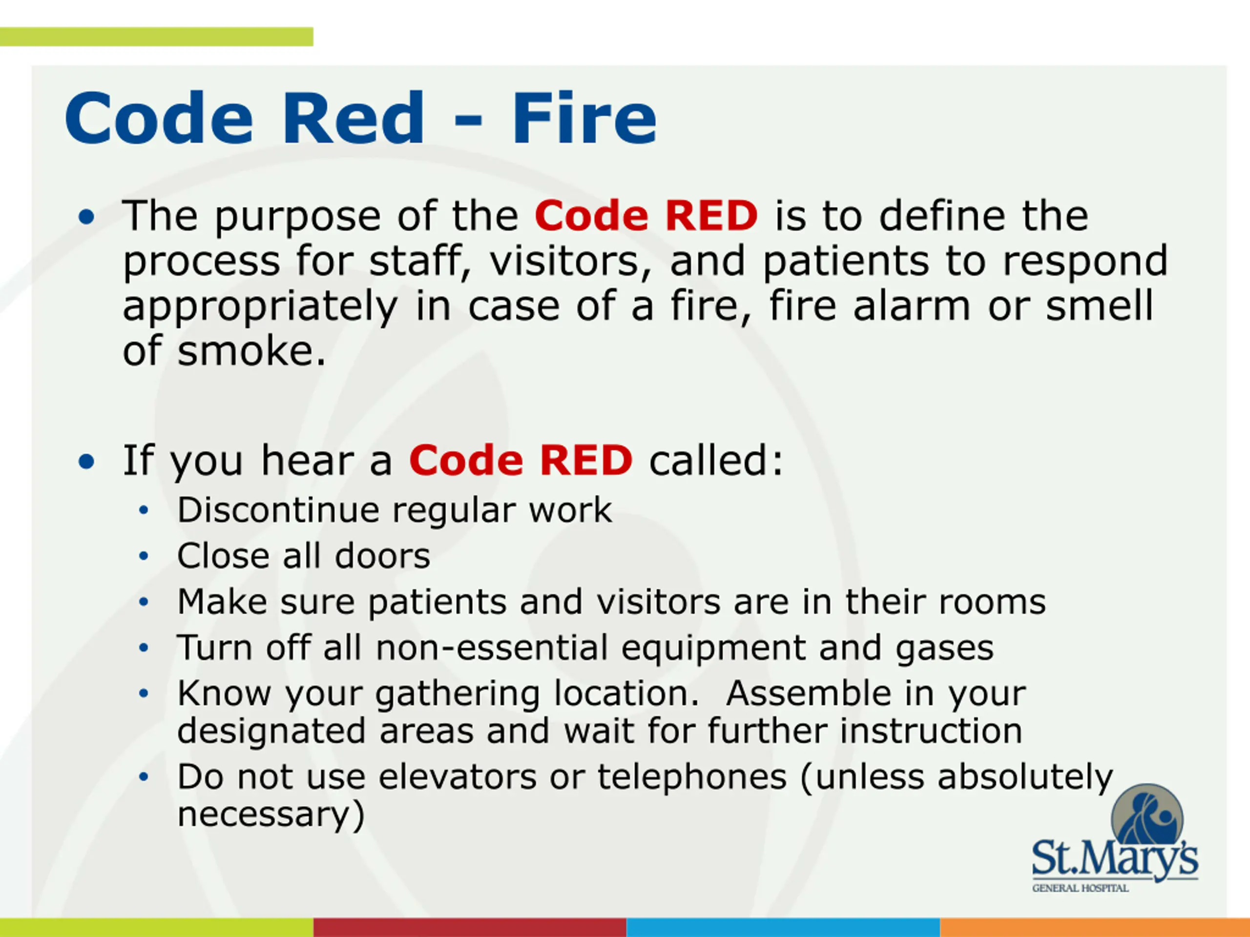 Code Red - Fire The purpose of the Code RED is to define the process for staff, visitors, and patients to respond appropriately in case of a fire, fire alarm or smell of smoke. If you hear a Code RED called: Discontinue regular work Close all doors Make sure patients and visitors are in their rooms Turn off all non-essential equipment and gases Know your gathering location. Assemble in your designated areas and wait for further instruction Do not use elevators or telephones (unless absolutely necessary)