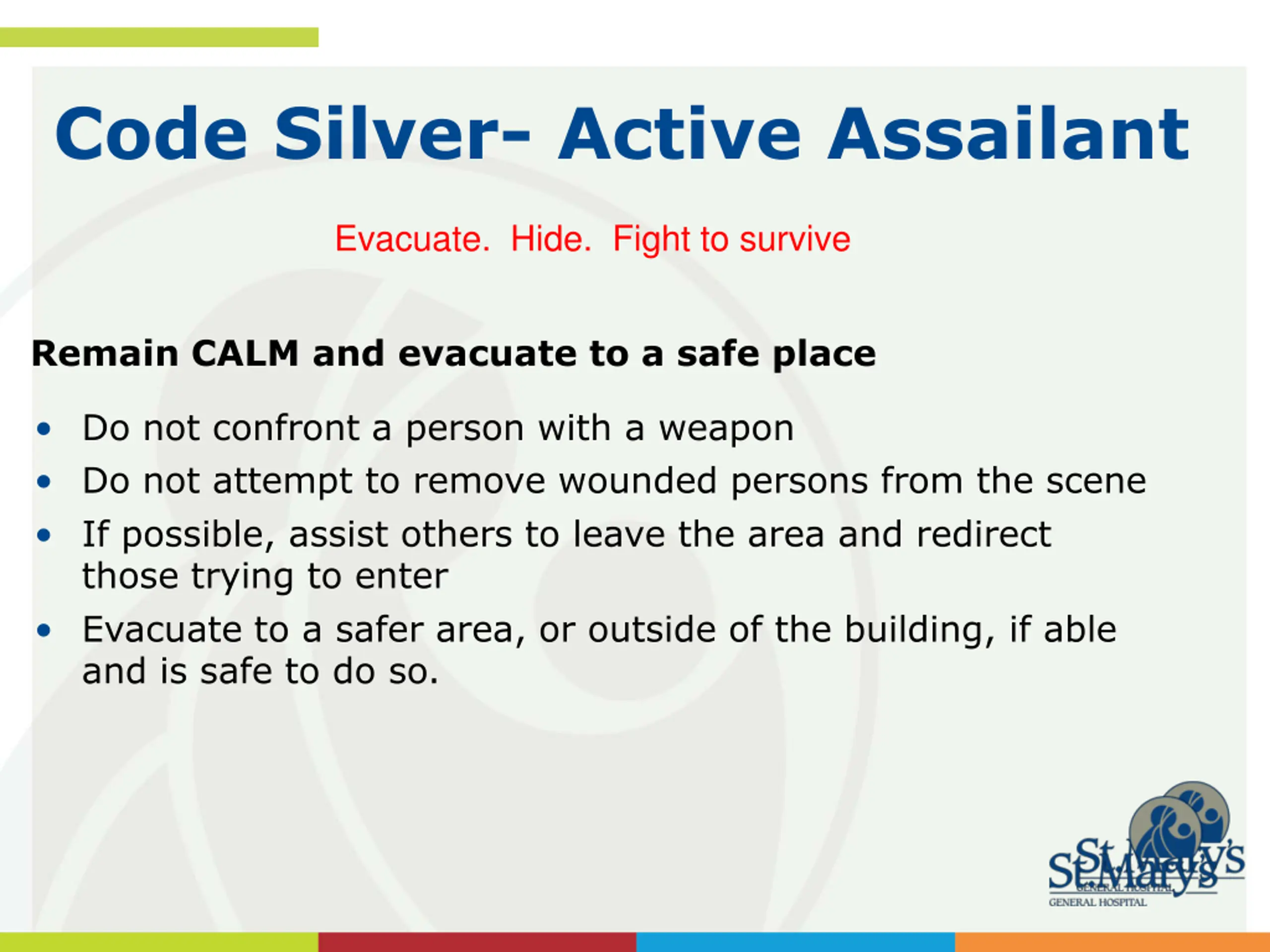 Code Silver- Active Assailant Evacuate. Hide. Fight to survive Remain CALM and evacuate to a safe place Do not confront a person with a weapon Do not attempt to remove wounded persons from the scene If possible, assist others to leave the area and redirect those trying to enter Evacuate to a safer area, or outside of the building, if able and is safe to do so.