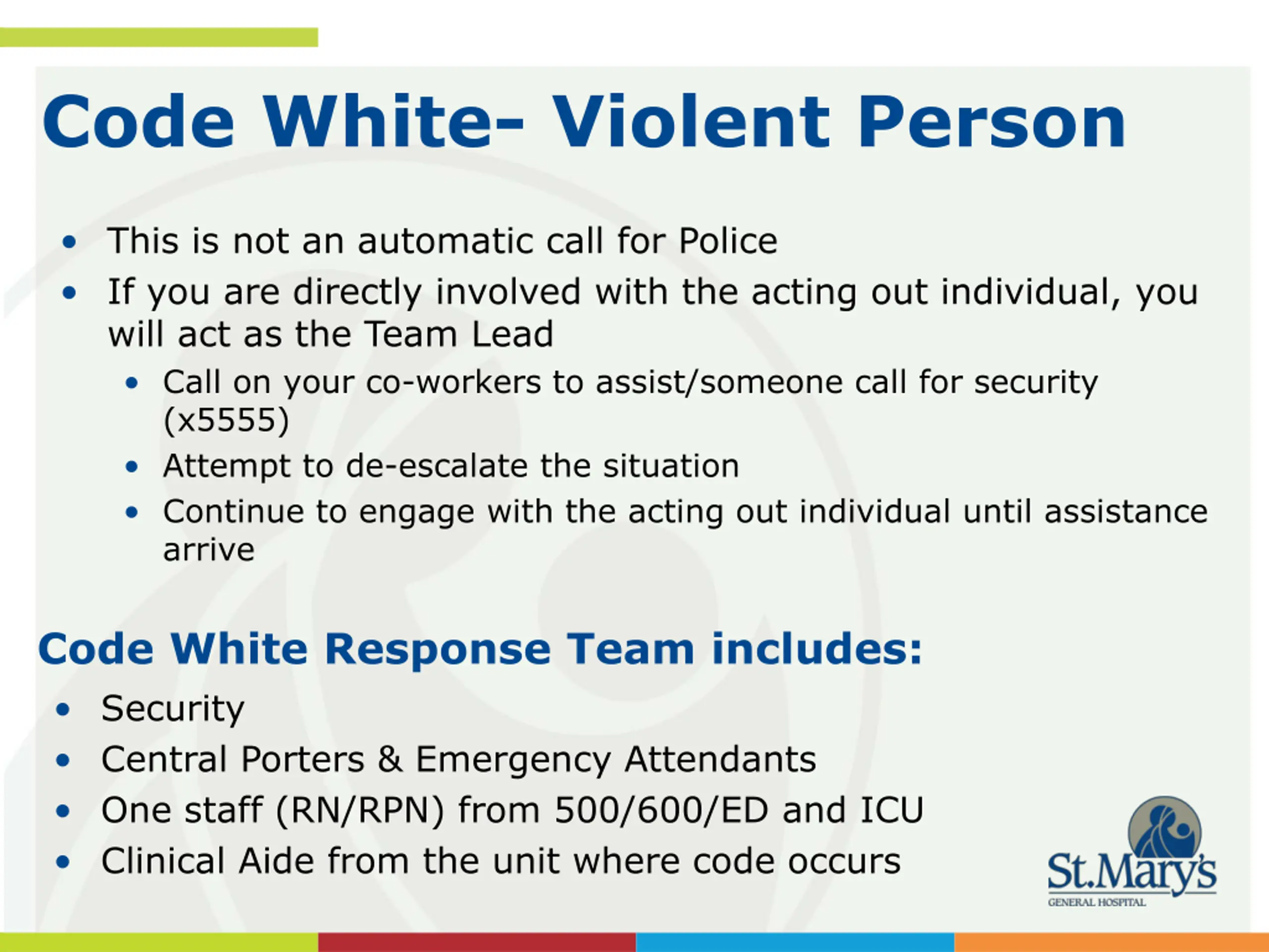 Code White- Violent Person This is not an automatic call for Police If you are directly involved with the acting out individual, you will act as the Team Lead Call on your co-workers to assist/someone call for security (x5555) Attempt to de-escalate the situation Continue to engage with the acting out individual until assistance arrive Code White Response Team includes: Security Central Porters & Emergency Attendants One staff (RN/RPN) from 500/600/ED and ICU Clinical Aide from the unit where code occurs