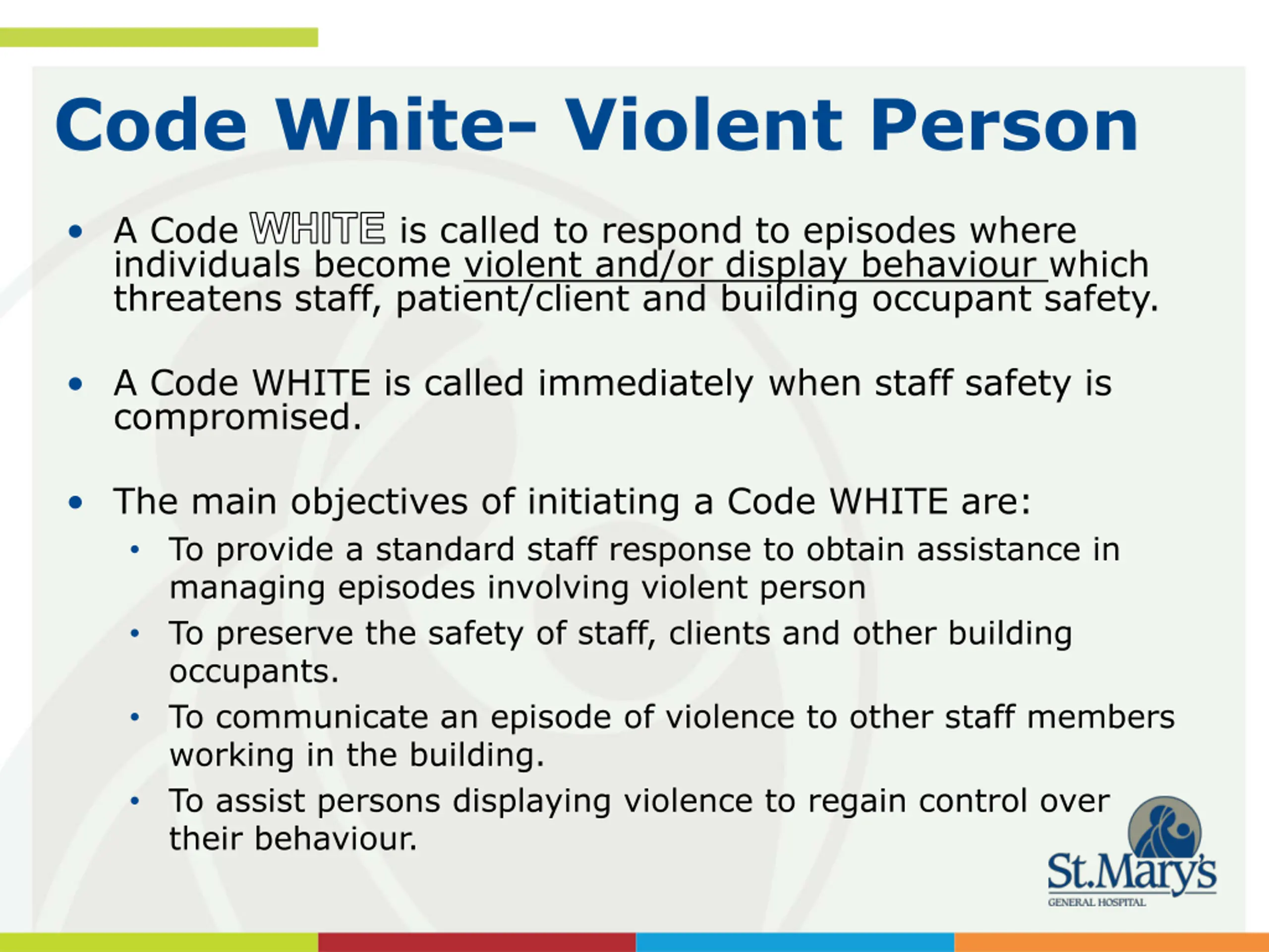 Code White- Violent Person WHITE A Code is called to respond to episodes where individuals become violent and/or display behaviour which threatens staff, patient/client and building occupant safety. A Code WHITE is called immediately when staff safety is compromised. The main objectives of initiating a Code WHITE are: To provide a standard staff response to obtain assistance in managing episodes involving violent person To preserve the safety of staff, clients and other building occupants. To communicate an episode of violence to other staff members working in the building. To assist persons displaying violence to regain control over their behaviour.