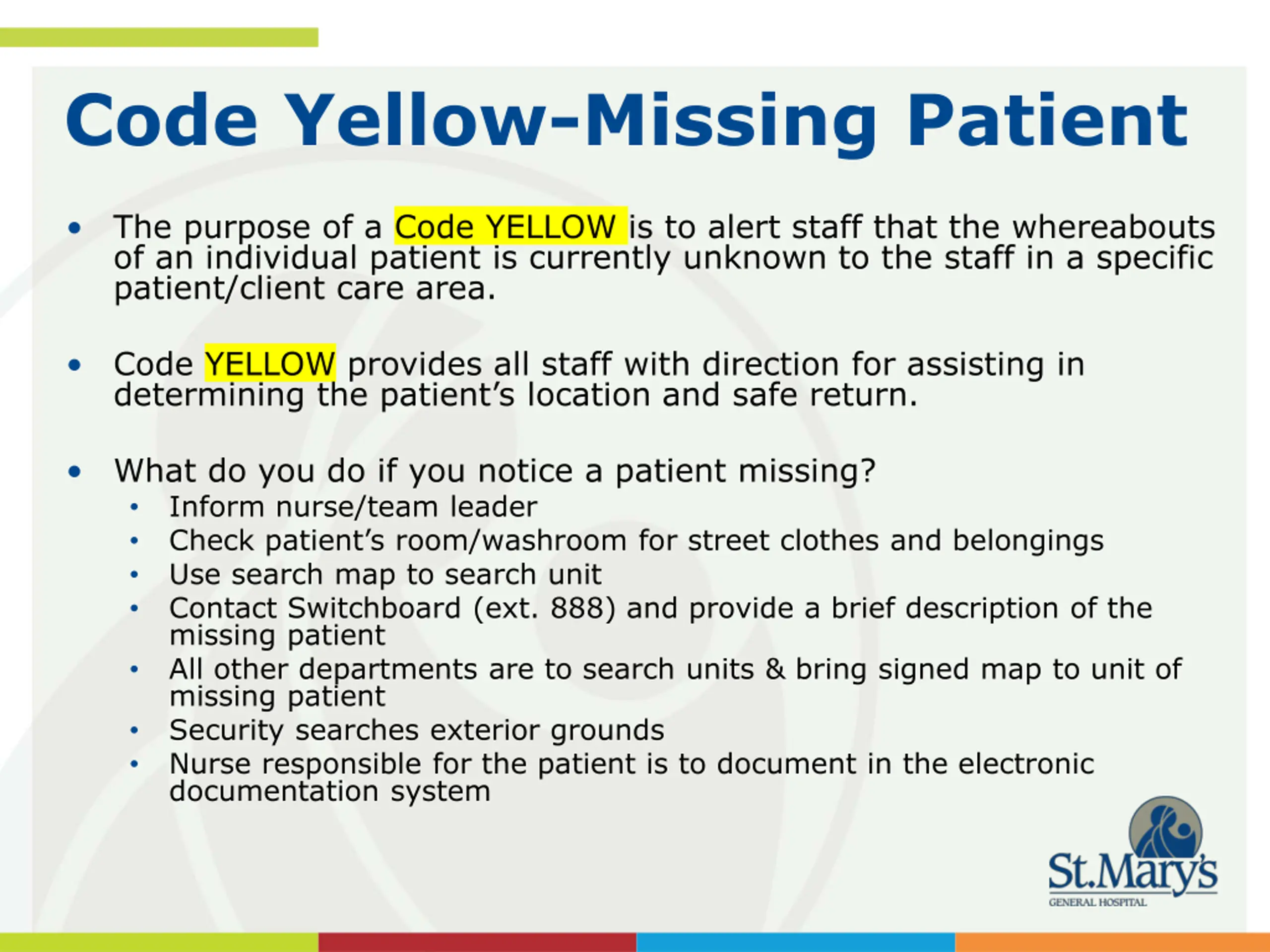 Code Yellow-Missing Patient The purpose of a Code YELLOW is to alert staff that the whereabouts of an individual patient is currently unknown to the staff in a specific patient/client care area. Code YELLOW provides all staff with direction for assisting in determining the patient s location and safe return. What do you do if you notice a patient missing? Inform nurse/team leader Check patient s room/washroom for street clothes and belongings Use search map to search unit Contact Switchboard (ext. 888) and provide a brief description of the missing patient All other departments are to search units & bring signed map to unit of missing patient Security searches exterior grounds Nurse responsible for the patient is to document in the electronic documentation system