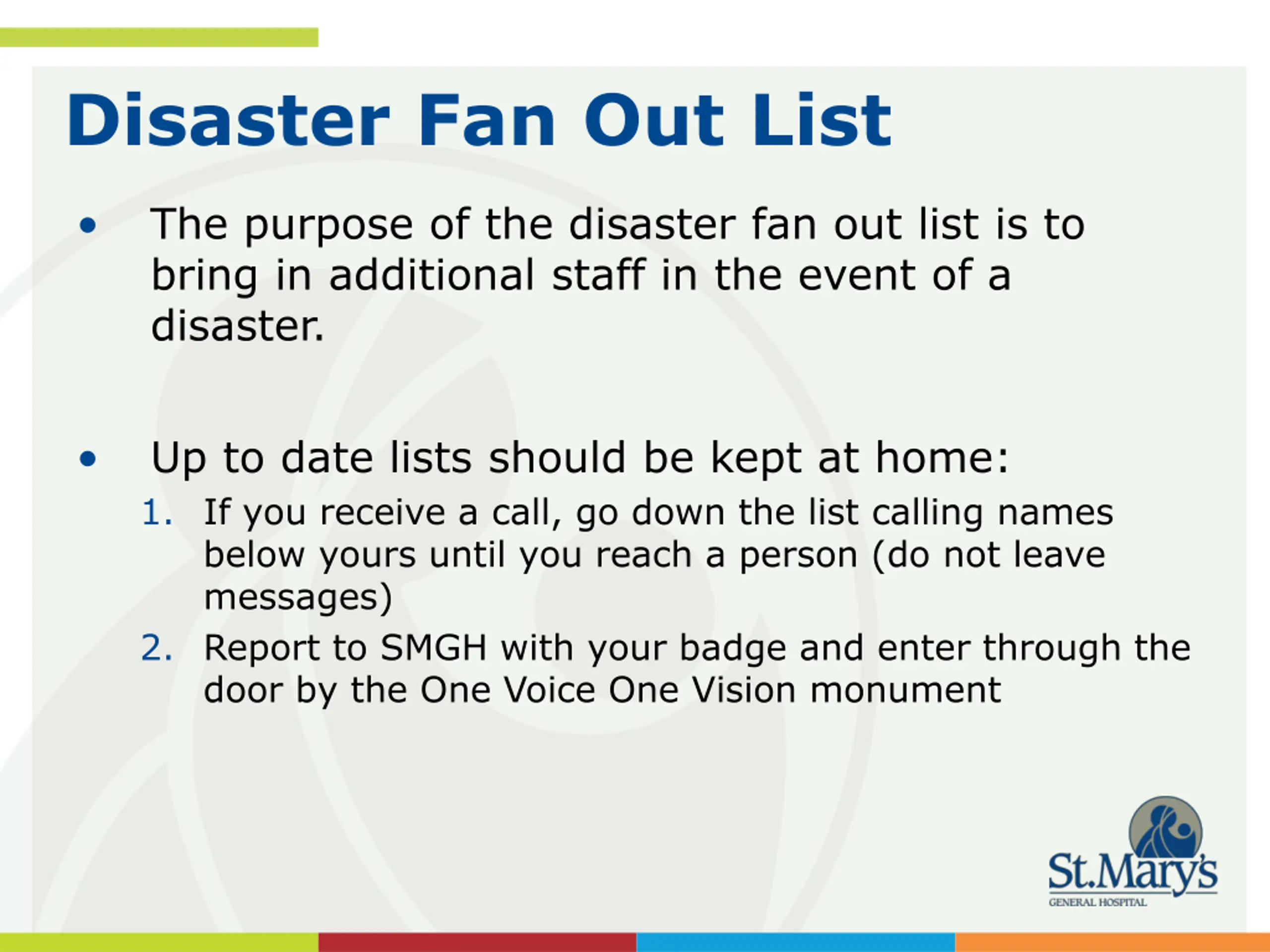 Disaster Fan Out List The purpose of the disaster fan out list is to bring in additional staff in the event of a disaster. Up to date lists should be kept at home: 1. If you receive a call, go down the list calling names below yours until you reach a person (do not leave messages) 2. Report to SMGH with your badge and enter through the door by the One Voice One Vision monument