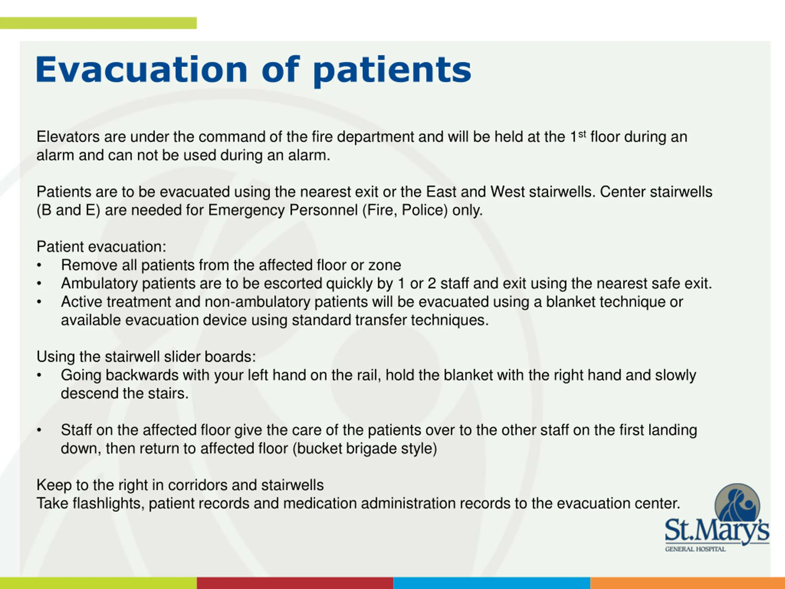 Evacuation of patients Elevators are under the command of the fire department and will be held at the 1st floor during an alarm and can not be used during an alarm. Patients are to be evacuated using the nearest exit or the East and West stairwells. Center stairwells (B and E) are needed for Emergency Personnel (Fire, Police) only. Patient evacuation: Remove all patients from the affected floor or zone Ambulatory patients are to be escorted quickly by 1 or 2 staff and exit using the nearest safe exit. Active treatment and non-ambulatory patients will be evacuated using a blanket technique or available evacuation device using standard transfer techniques. Using the stairwell slider boards: Going backwards with your left hand on the rail, hold the blanket with the right hand and slowly descend the stairs. Staff on the affected floor give the care of the patients over to the other staff on the first landing down, then return to affected floor (bucket brigade style) Keep to the right in corridors and stairwells Take flashlights, patient records and medication administration records to the evacuation center.
