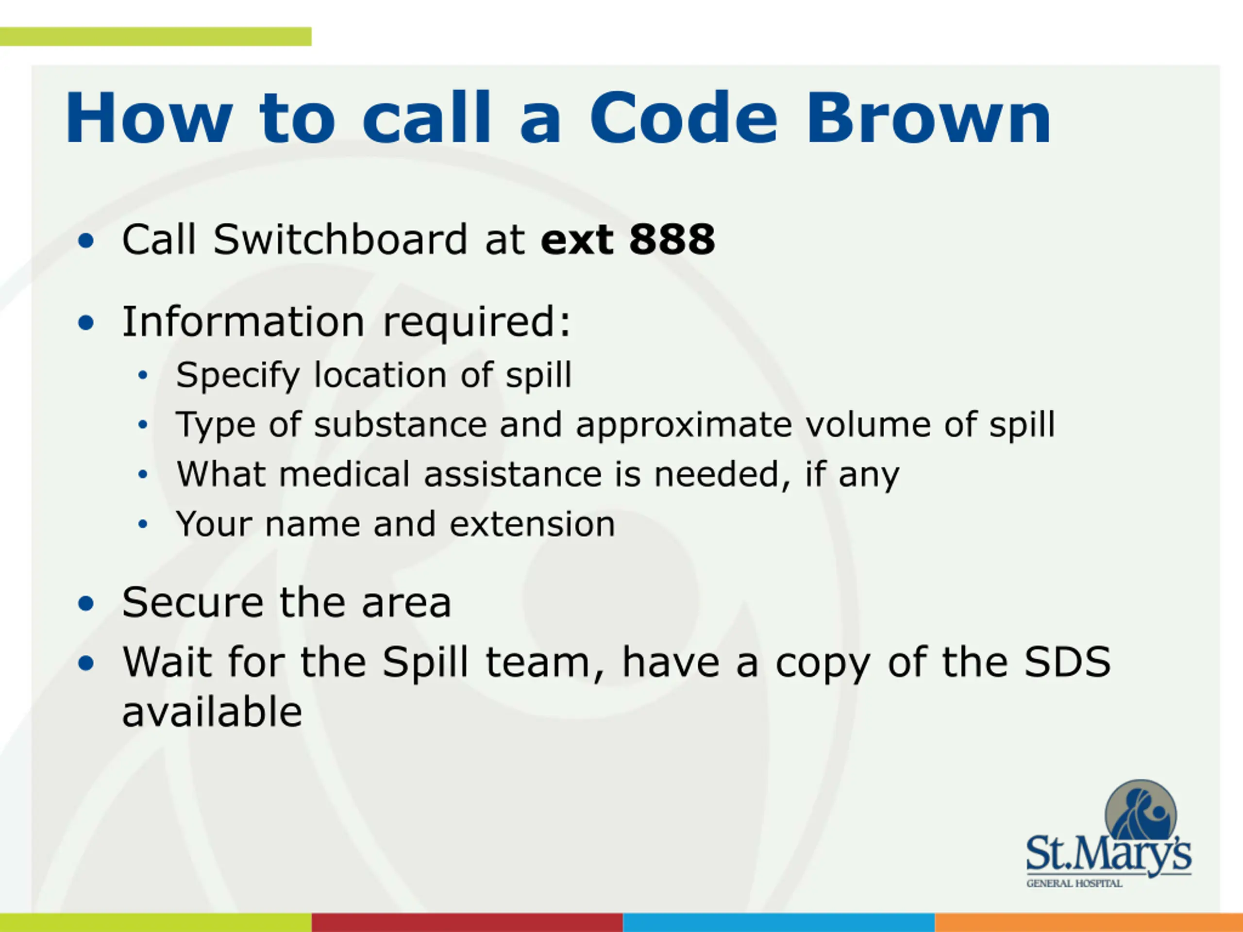 How to call a Code Brown Call Switchboard at ext 888 Information required: Specify location of spill Type of substance and approximate volume of spill What medical assistance is needed, if any Your name and extension Secure the area Wait for the Spill team, have a copy of the SDS available