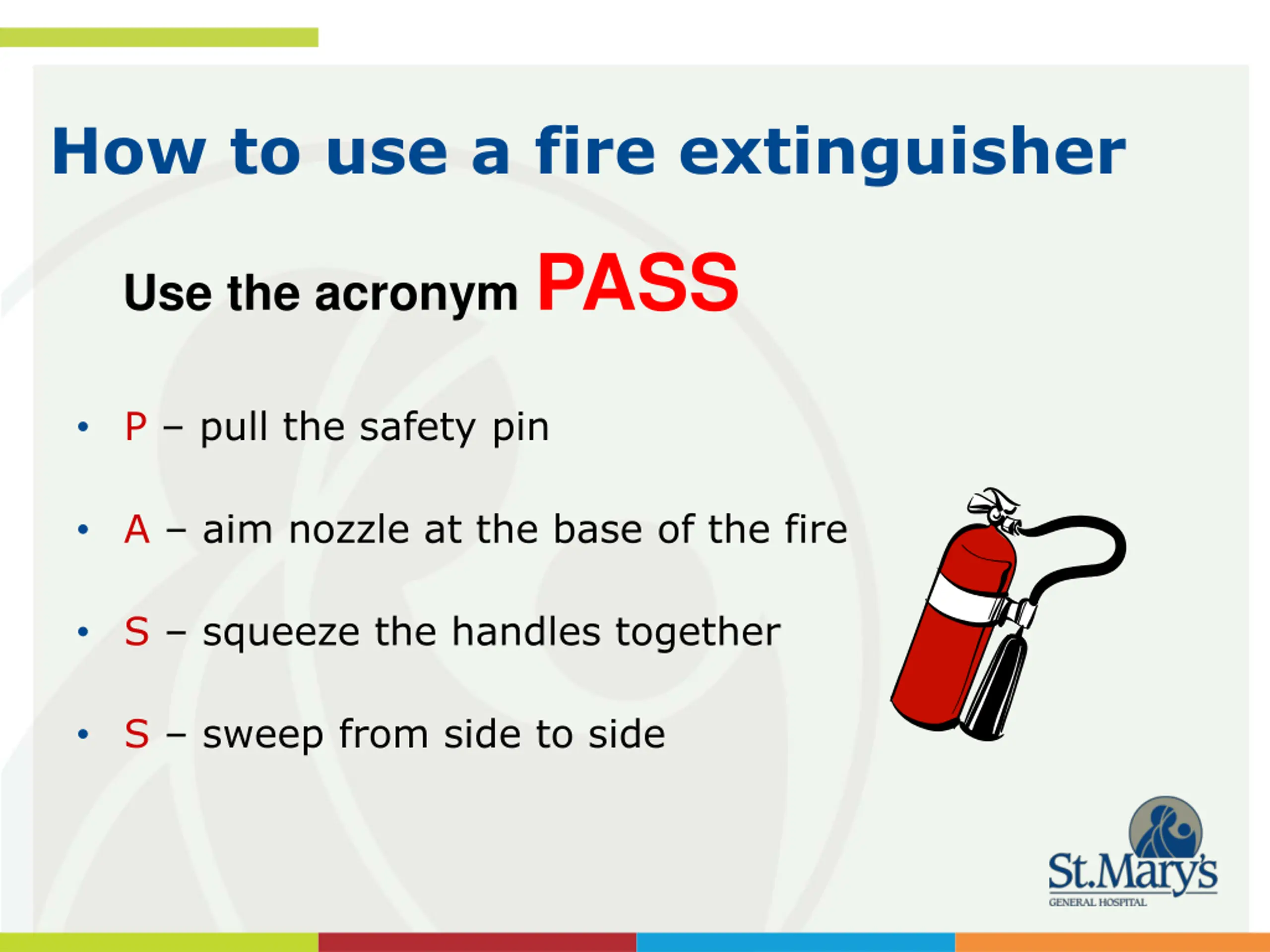 How to use a fire extinguisher Use the acronym PASS P pull the safety pin A aim nozzle at the base of the fire S squeeze the handles together S sweep from side to side