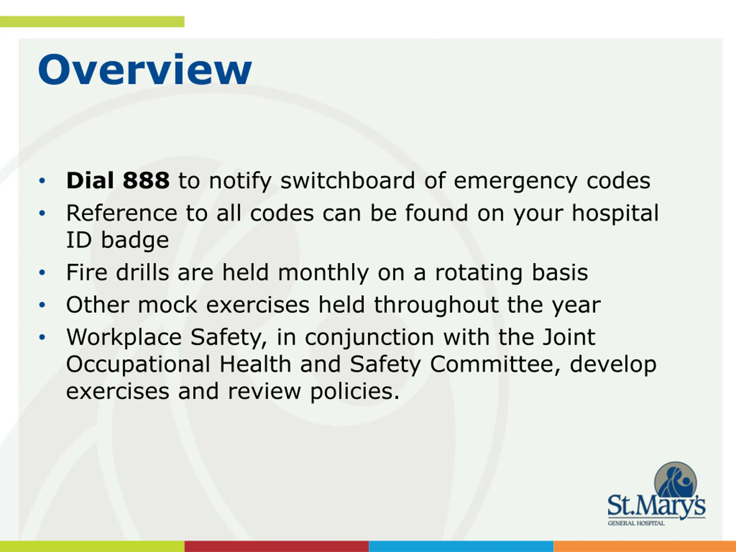Overview Dial 888 to notify switchboard of emergency codes Reference to all codes can be found on your hospital ID badge Fire drills are held monthly on a rotating basis Other mock exercises held throughout the year Workplace Safety, in conjunction with the Joint Occupational Health and Safety Committee, develop exercises and review policies.