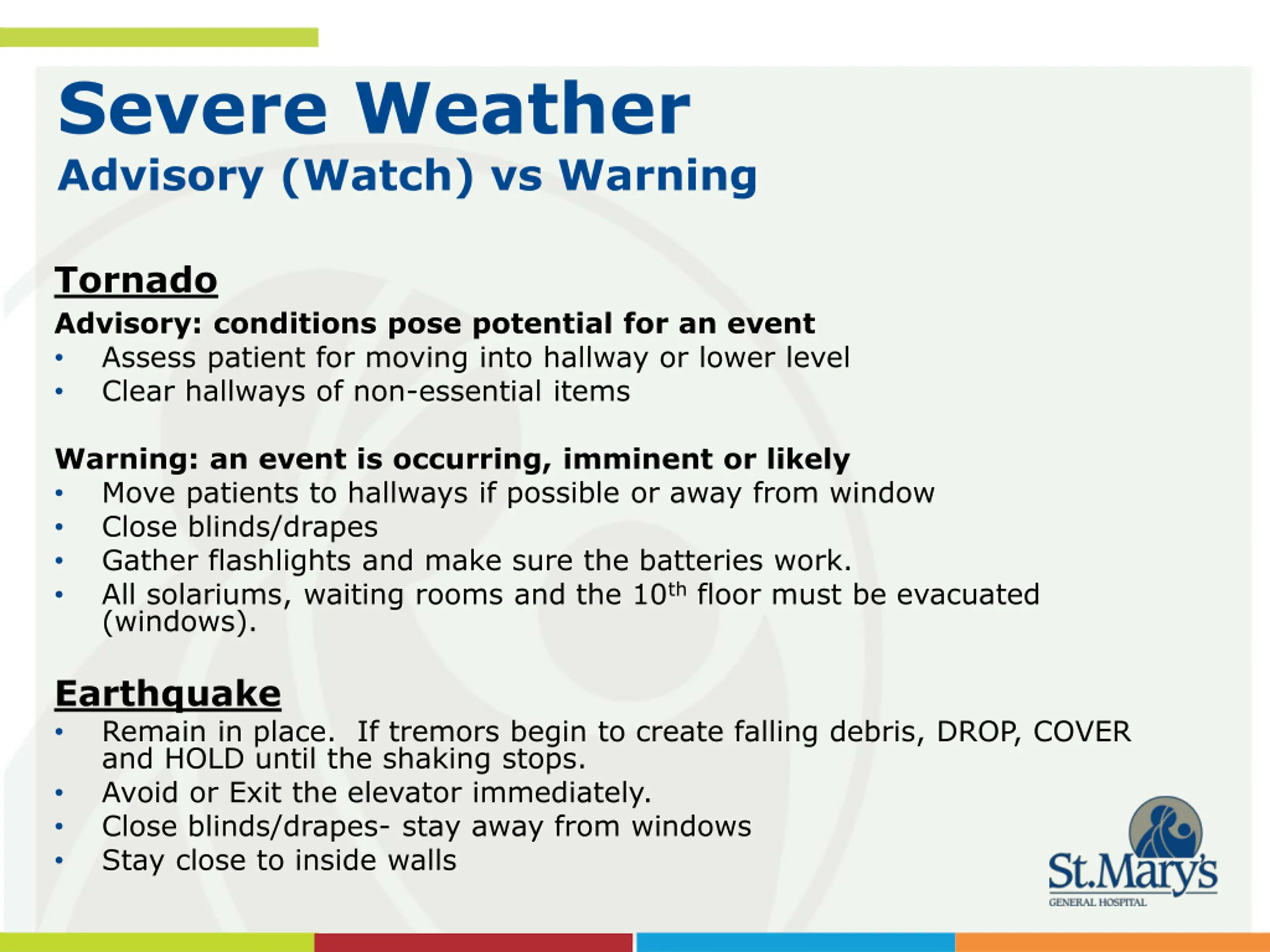 Severe Weather Advisory (Watch) vs Warning Tornado Advisory: conditions pose potential for an event Assess patient for moving into hallway or lower level Clear hallways of non-essential items Warning: an event is occurring, imminent or likely Move patients to hallways if possible or away from window Close blinds/drapes Gather flashlights and make sure the batteries work. All solariums, waiting rooms and the 10th floor must be evacuated (windows). Earthquake Remain in place. If tremors begin to create falling debris, DROP, COVER and HOLD until the shaking stops. Avoid or Exit the elevator immediately. Close blinds/drapes- stay away from windows Stay close to inside walls