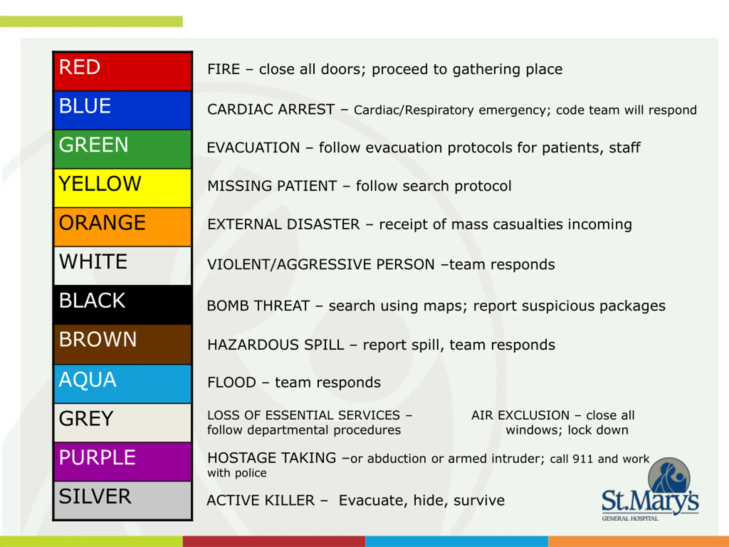 RED FIRE close all doors; proceed to gathering place BLUE CARDIAC ARREST Cardiac/Respiratory emergency; code team will respond GREEN EVACUATION follow evacuation protocols for patients, staff YELLOW MISSING PATIENT follow search protocol ORANGE EXTERNAL DISASTER receipt of mass casualties incoming WHITE VIOLENT/AGGRESSIVE PERSON team responds BLACK BOMB THREAT search using maps; report suspicious packages BROWN HAZARDOUS SPILL report spill, team responds AQUA FLOOD team responds GREY LOSS OF ESSENTIAL SERVICES follow departmental procedures AIR EXCLUSION close all windows; lock down PURPLE HOSTAGE TAKING or abduction or armed intruder; call 911 and work with police SILVER ACTIVE KILLER Evacuate, hide, survive