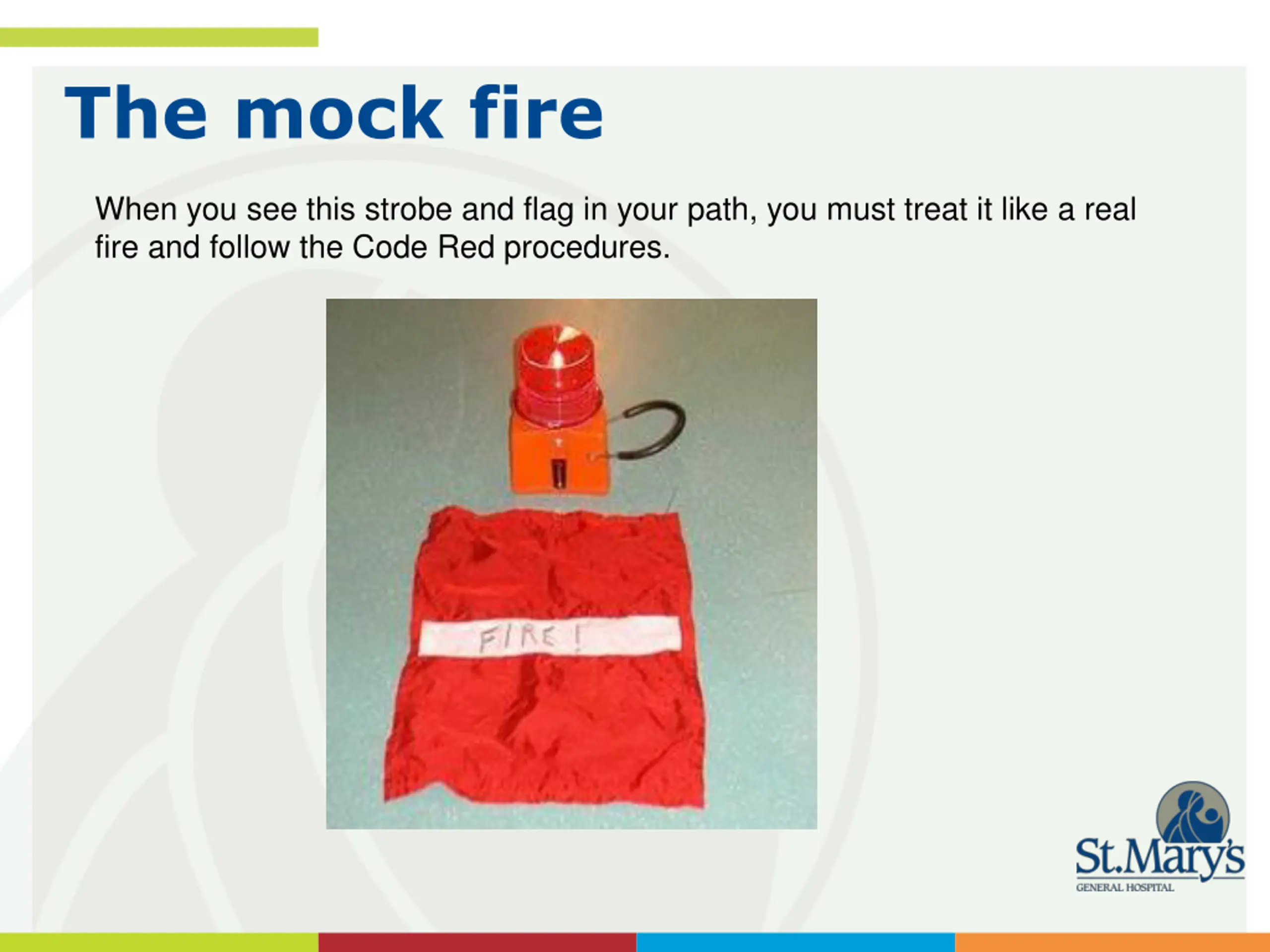 The mock fire When you see this strobe and flag in your path, you must treat it like a real fire and follow the Code Red procedures.