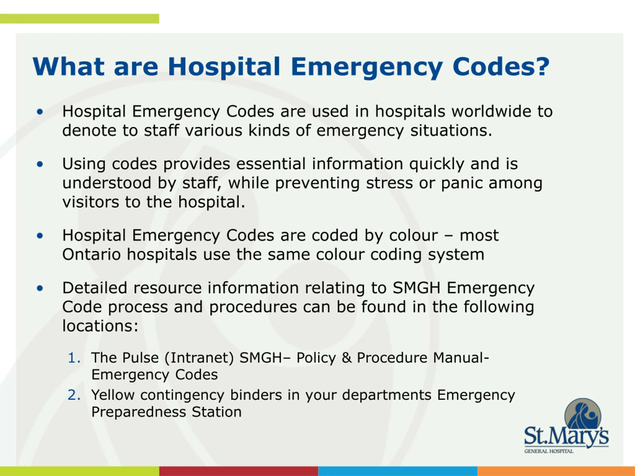 What are Hospital Emergency Codes? Hospital Emergency Codes are used in hospitals worldwide to denote to staff various kinds of emergency situations. Using codes provides essential information quickly and is understood by staff, while preventing stress or panic among visitors to the hospital. Hospital Emergency Codes are coded by colour most Ontario hospitals use the same colour coding system Detailed resource information relating to SMGH Emergency Code process and procedures can be found in the following locations: 1. The Pulse (Intranet) SMGH Policy & Procedure Manual- Emergency Codes 2. Yellow contingency binders in your departments Emergency Preparedness Station