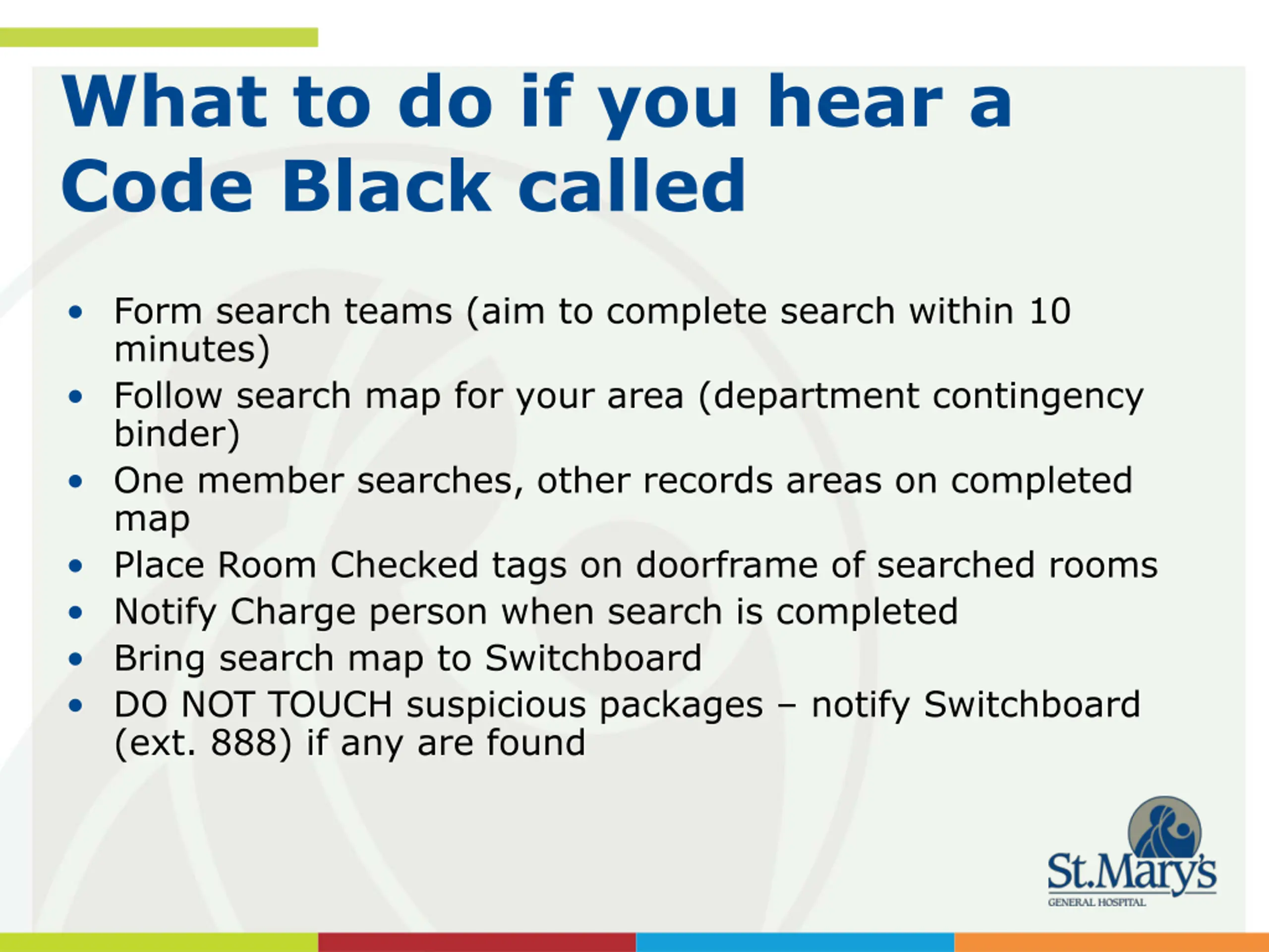 What to do if you hear a Code Black called Form search teams (aim to complete search within 10 minutes) Follow search map for your area (department contingency binder) One member searches, other records areas on completed map Place Room Checked tags on doorframe of searched rooms Notify Charge person when search is completed Bring search map to Switchboard DO NOT TOUCH suspicious packages notify Switchboard (ext. 888) if any are found