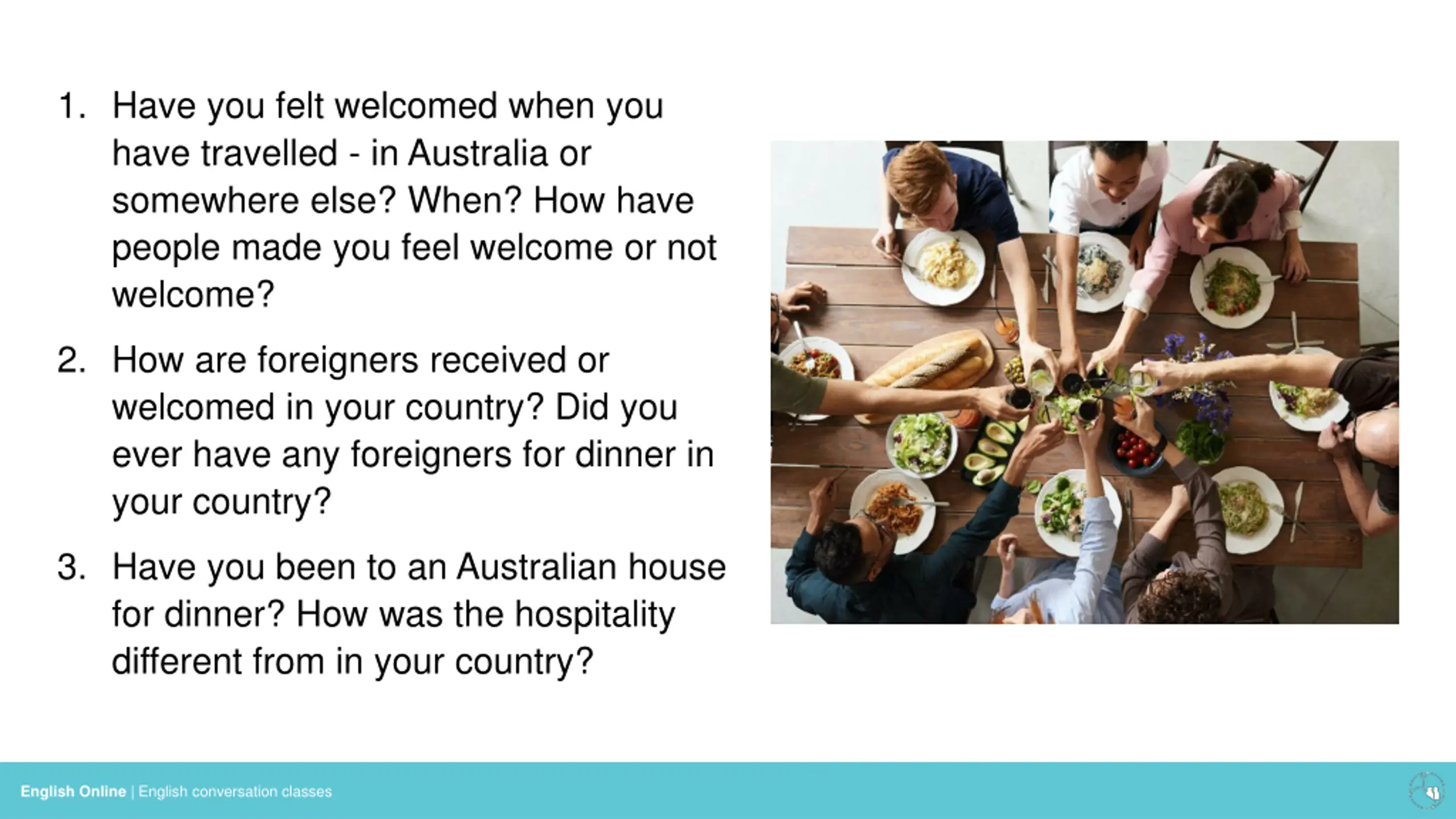 1. Have you felt welcomed when you have travelled - in Australia or somewhere else? When? How have people made you feel welcome or not welcome? 2. How are foreigners received or welcomed in your country? Did you ever have any foreigners for dinner in your country? 3. Have you been to an Australian house for dinner? How was the hospitality different from in your country? English Online | English conversation classes