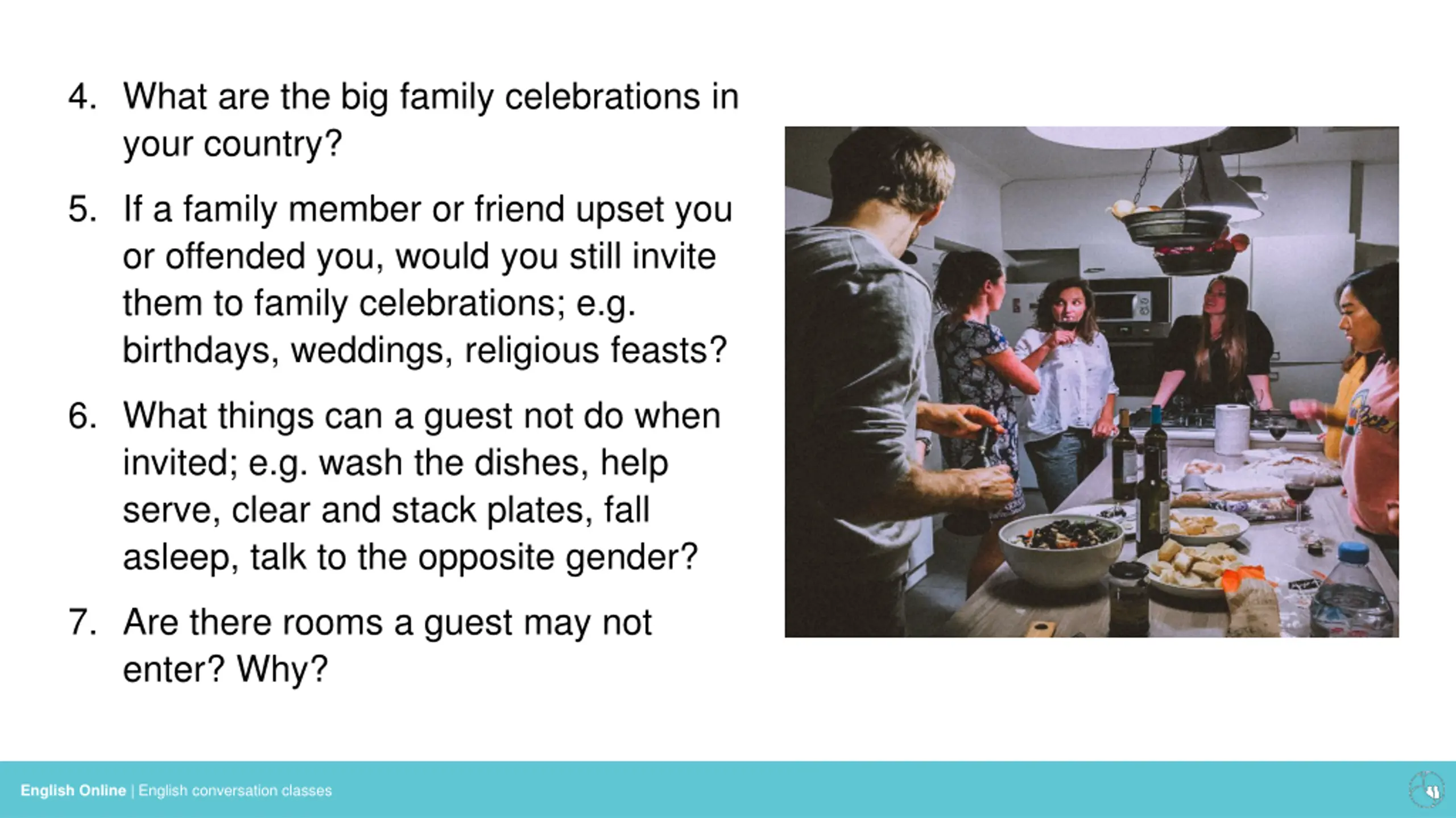 4. What are the big family celebrations in your country? 5. If a family member or friend upset you or offended you, would you still invite them to family celebrations; e.g. birthdays, weddings, religious feasts? 6. What things can a guest not do when invited; e.g. wash the dishes, help serve, clear and stack plates, fall asleep, talk to the opposite gender? 7. Are there rooms a guest may not enter? Why? English Online | English conversation classes