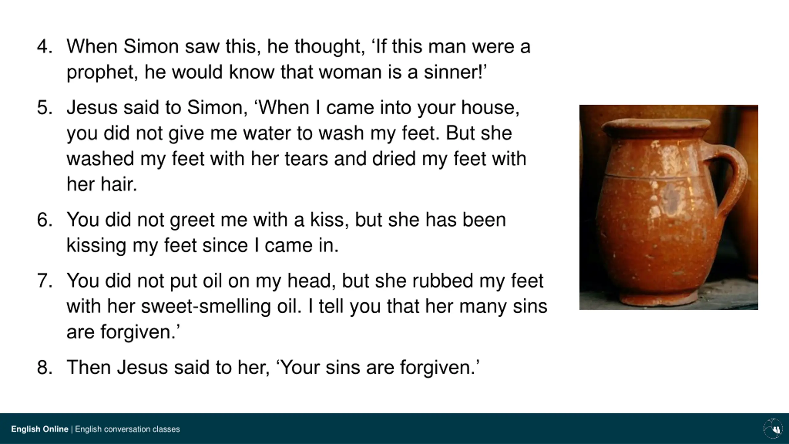4. When Simon saw this, he thought, If this man were a prophet, he would know that woman is a sinner! 5. Jesus said to Simon, When I came into your house, you did not give me water to wash my feet. But she washed my feet with her tears and dried my feet with her hair. 6. You did not greet me with a kiss, but she has been kissing my feet since I came in. 7. You did not put oil on my head, but she rubbed my feet with her sweet-smelling oil. I tell you that her many sins are forgiven. 8. Then Jesus said to her, Your sins are forgiven. English Online | English conversation classes