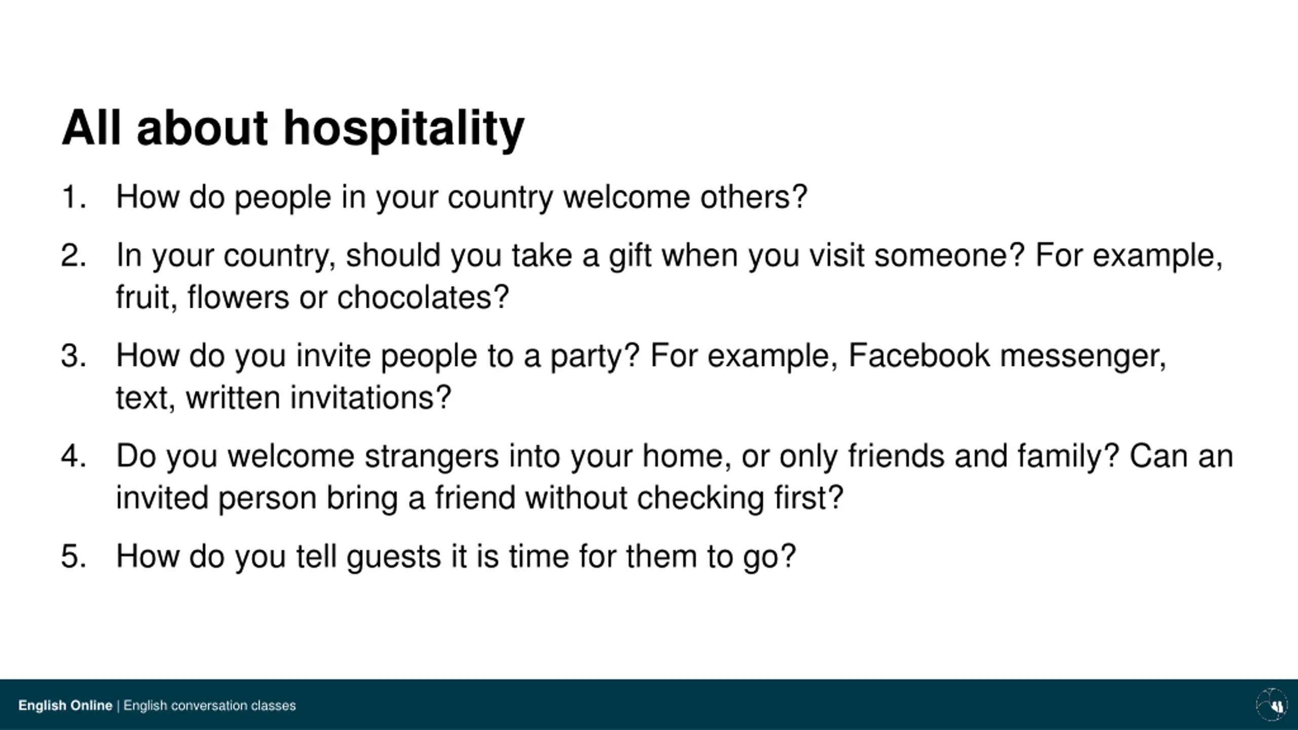 All about hospitality 1. How do people in your country welcome others? 2. In your country, should you take a gift when you visit someone? For example, fruit, flowers or chocolates? 3. How do you invite people to a party? For example, Facebook messenger, text, written invitations? 4. Do you welcome strangers into your home, or only friends and family? Can an invited person bring a friend without checking first? 5. How do you tell guests it is time for them to go? English Online | English conversation classes