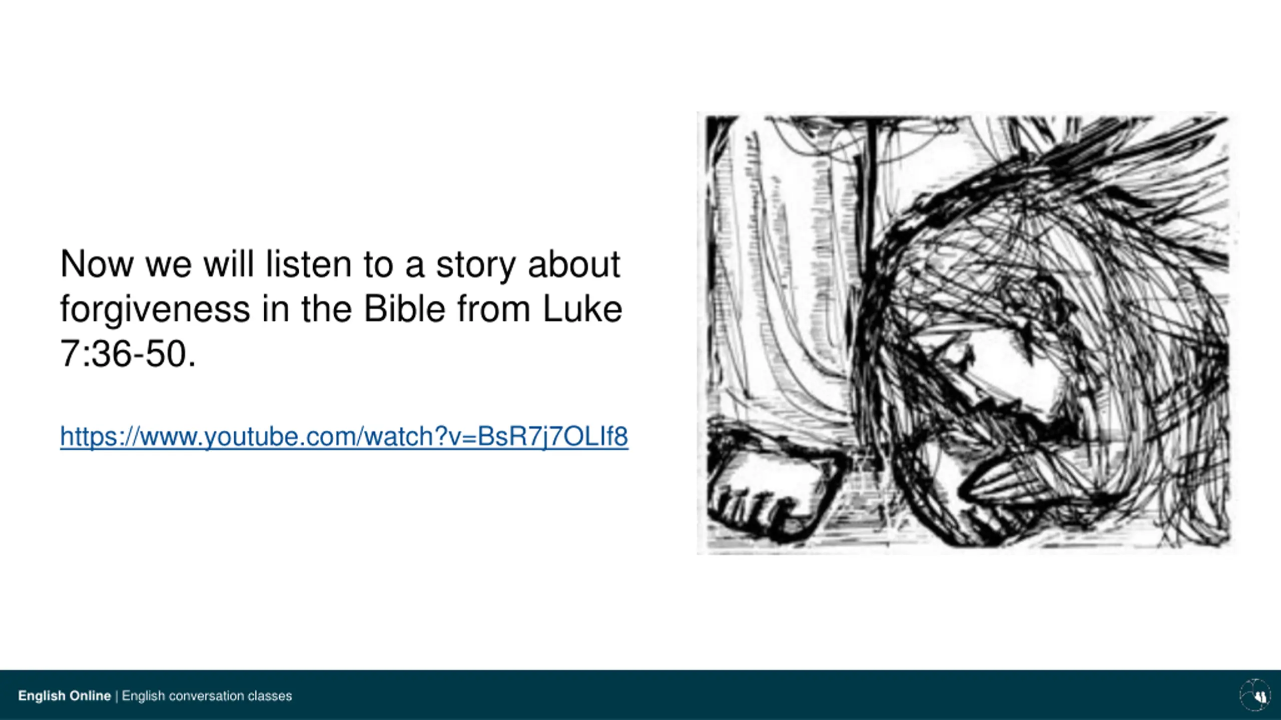 Now we will listen to a story about forgiveness in the Bible from Luke 7:36-50. https://www.youtube.com/watch?v=BsR7j7OLIf8 English Online | English conversation classes