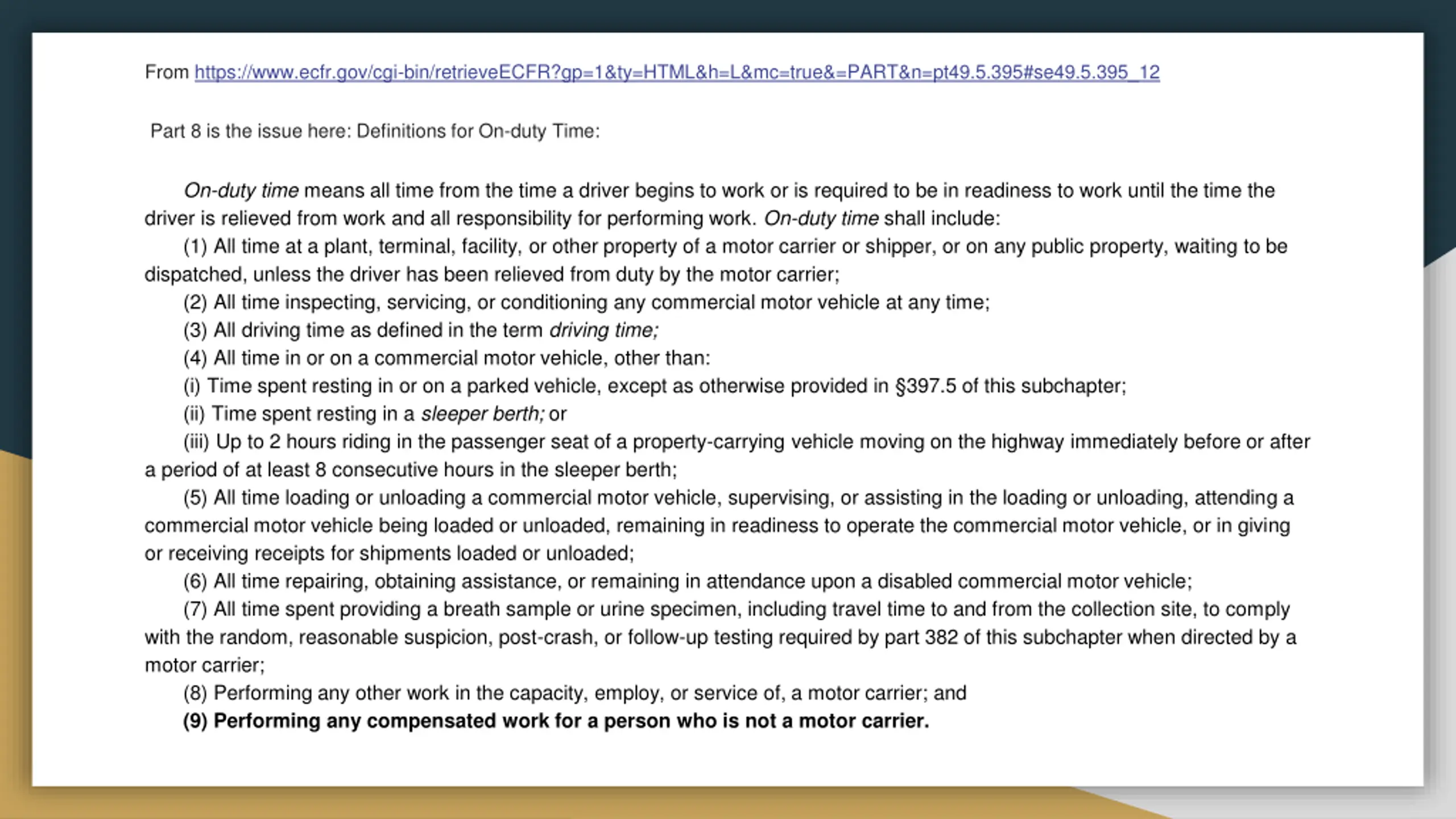 From https://www.ecfr.gov/cgi-bin/retrieveECFR?gp=1&ty=HTML&h=L&mc=true&=PART&n=pt49.5.395#se49.5.395_12 Part 8 is the issue here: Definitions for On-duty Time: On-duty time means all time from the time a driver begins to work or is required to be in readiness to work until the time the driver is relieved from work and all responsibility for performing work. On-duty time shall include: (1) All time at a plant, terminal, facility, or other property of a motor carrier or shipper, or on any public property, waiting to be dispatched, unless the driver has been relieved from duty by the motor carrier; (2) All time inspecting, servicing, or conditioning any commercial motor vehicle at any time; (3) All driving time as defined in the term driving time; (4) All time in or on a commercial motor vehicle, other than: (i) Time spent resting in or on a parked vehicle, except as otherwise provided in 397.5 of this subchapter; (ii) Time spent resting in a sleeper berth; or (iii) Up to 2 hours riding in the passenger seat of a property-carrying vehicle moving on the highway immediately before or after a period of at least 8 consecutive hours in the sleeper berth; (5) All time loading or unloading a commercial motor vehicle, supervising, or assisting in the loading or unloading, attending a commercial motor vehicle being loaded or unloaded, remaining in readiness to operate the commercial motor vehicle, or in giving or receiving receipts for shipments loaded or unloaded; (6) All time repairing, obtaining assistance, or remaining in attendance upon a disabled commercial motor vehicle; (7) All time spent providing a breath sample or urine specimen, including travel time to and from the collection site, to comply with the random, reasonable suspicion, post-crash, or follow-up testing required by part 382 of this subchapter when directed by a motor carrier; (8) Performing any other work in the capacity, employ, or service of, a motor carrier; and (9) Performing any compensated work for a person who is not a motor carrier.