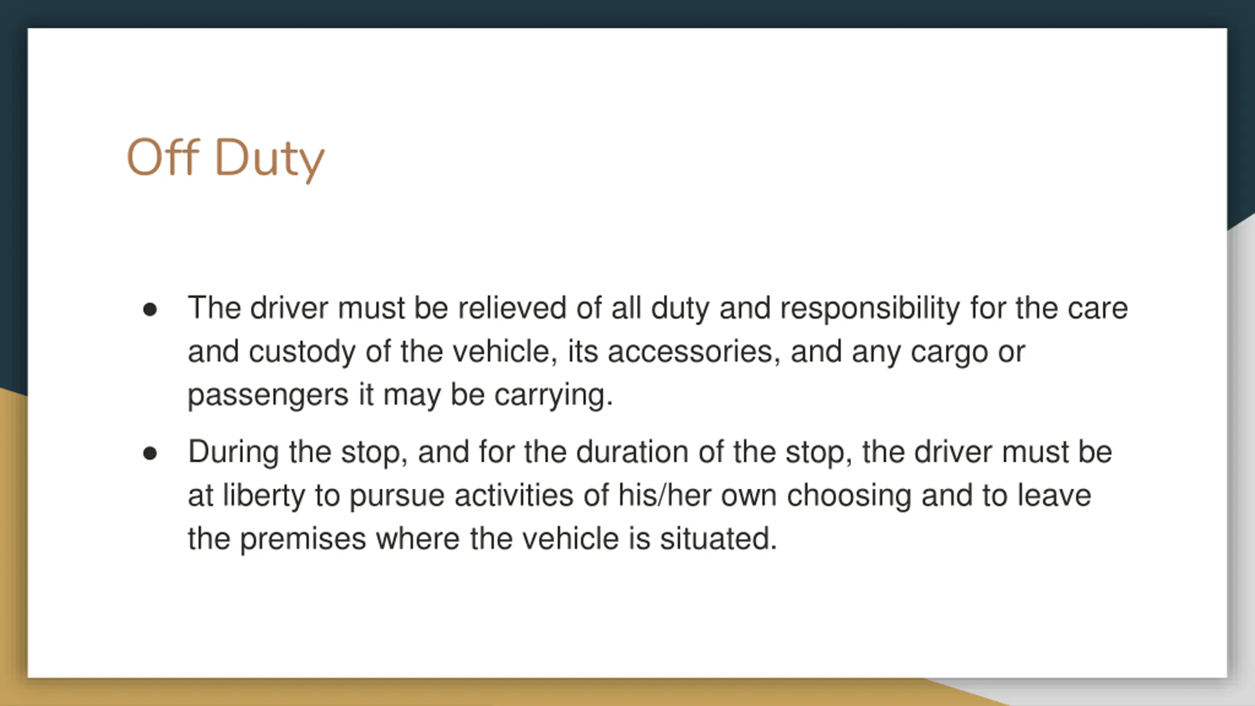Off Duty The driver must be relieved of all duty and responsibility for the care and custody of the vehicle, its accessories, and any cargo or passengers it may be carrying. During the stop, and for the duration of the stop, the driver must be at liberty to pursue activities of his/her own choosing and to leave the premises where the vehicle is situated.