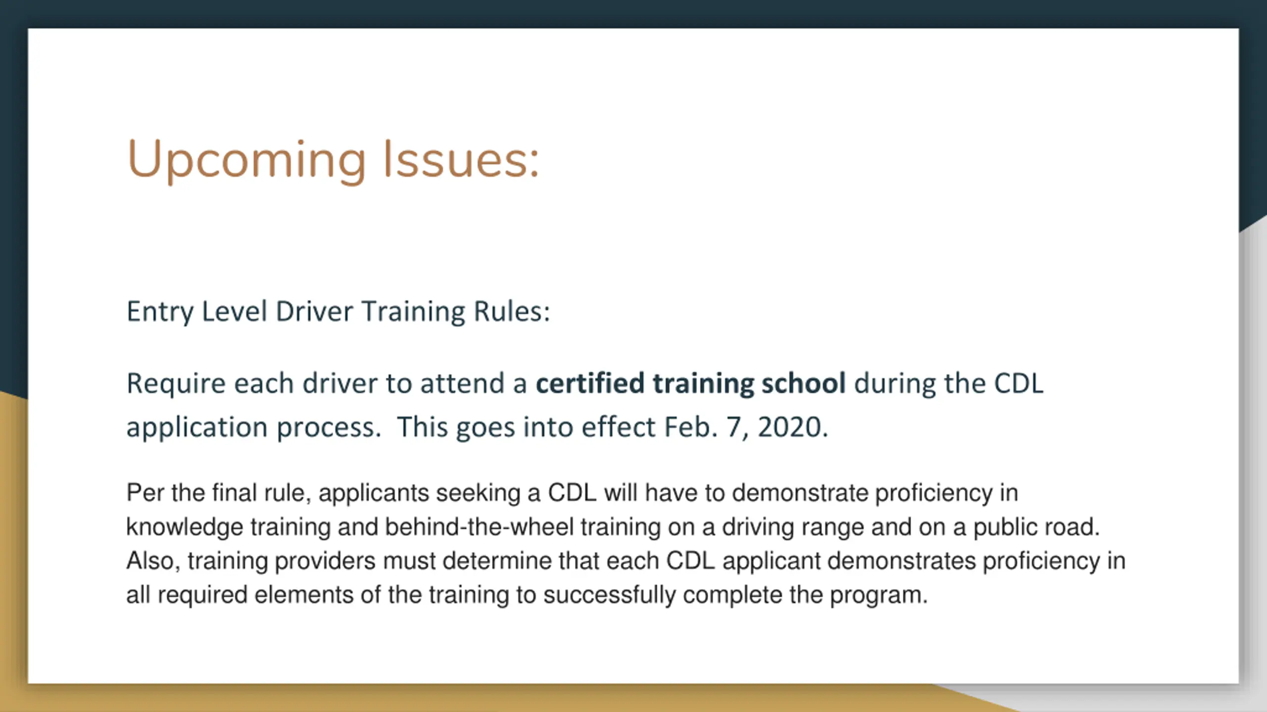 Upcoming Issues: Entry Level Driver Training Rules: Require each driver to attend a certified training school during the CDL application process. This goes into effect Feb. 7, 2020. Per the final rule, applicants seeking a CDL will have to demonstrate proficiency in knowledge training and behind-the-wheel training on a driving range and on a public road. Also, training providers must determine that each CDL applicant demonstrates proficiency in all required elements of the training to successfully complete the program.