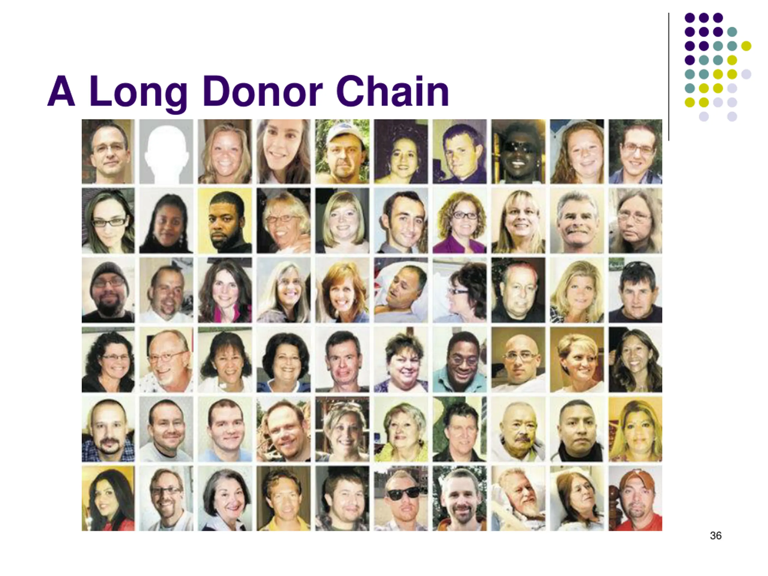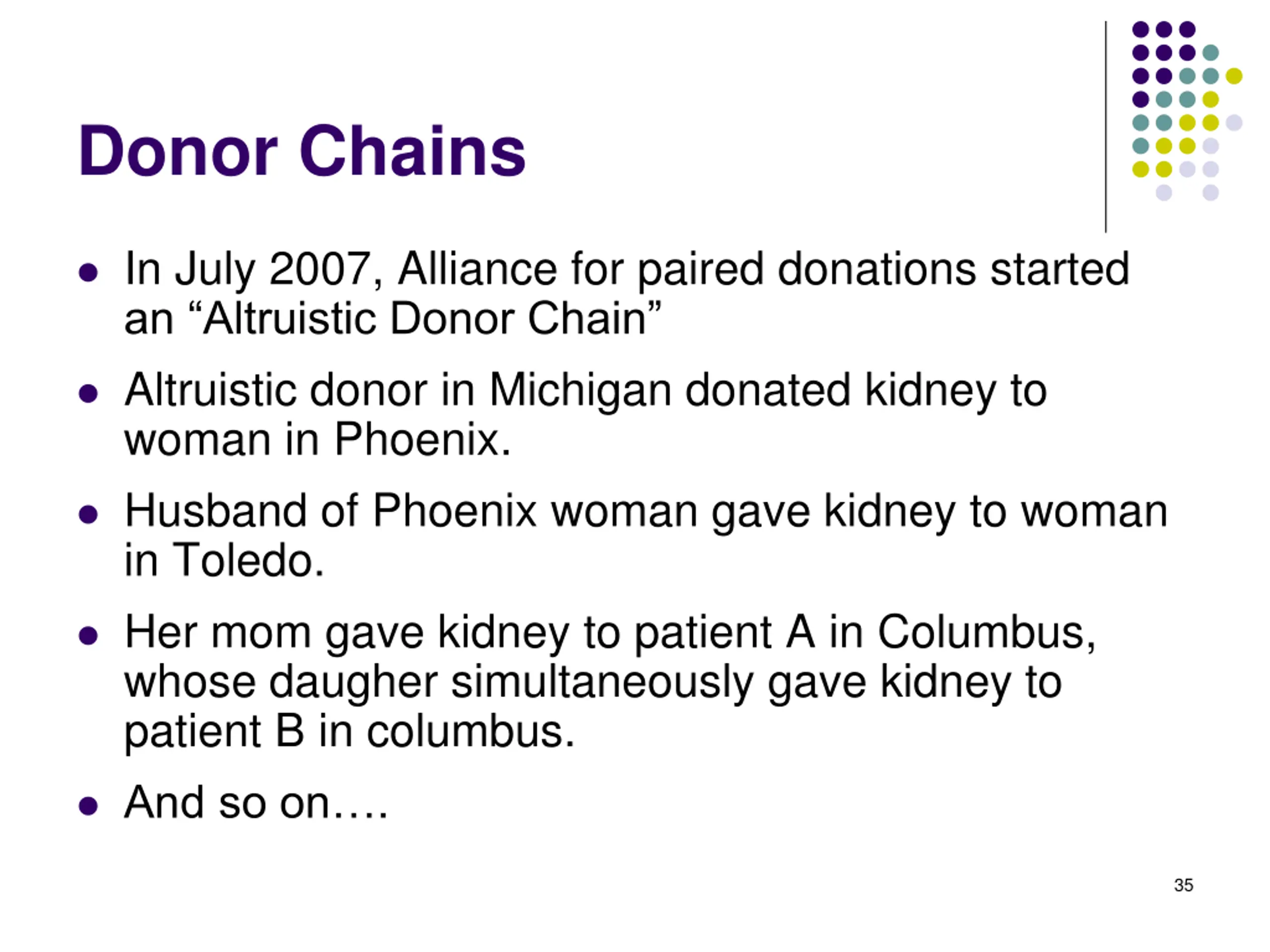 Donor Chains In July 2007, Alliance for paired donations started an Altruistic Donor Chain Altruistic donor in Michigan donated kidney to woman in Phoenix. Husband of Phoenix woman gave kidney to woman in Toledo. Her mom gave kidney to patient A in Columbus, whose daugher simultaneously gave kidney to patient B in columbus. And so on . 35