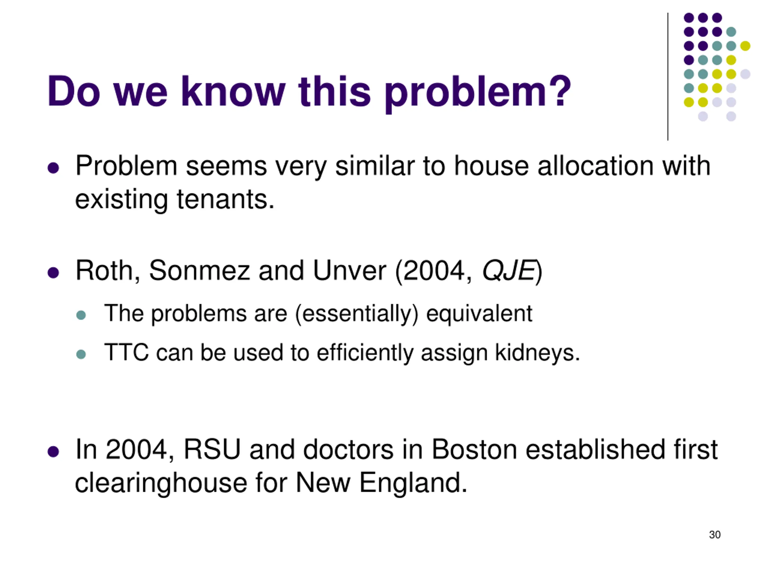 Do we know this problem? Problem seems very similar to house allocation with existing tenants. Roth, Sonmez and Unver (2004, QJE) The problems are (essentially) equivalent TTC can be used to efficiently assign kidneys. In 2004, RSU and doctors in Boston established first clearinghouse for New England. 30