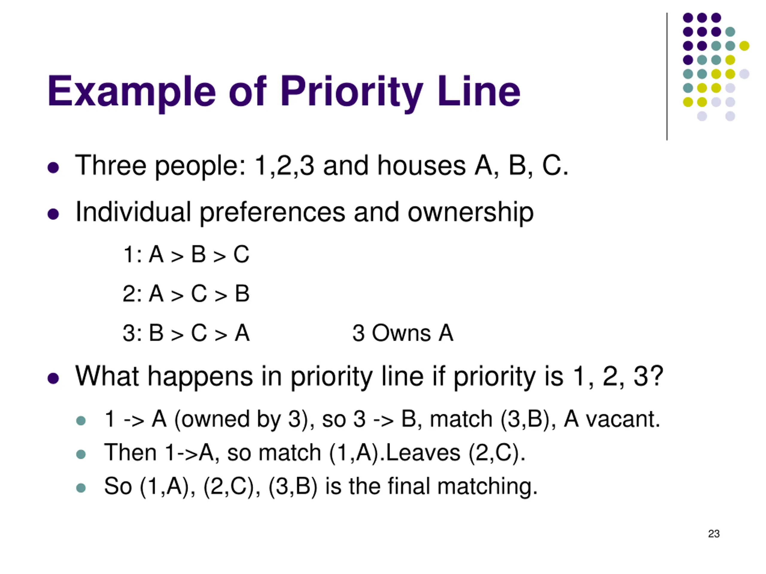 Example of Priority Line Three people: 1,2,3 and houses A, B, C. Individual preferences and ownership 1: A > B > C 2: A > C > B 3: B > C > A 3 Owns A What happens in priority line if priority is 1, 2, 3? 1 -> A (owned by 3), so 3 -> B, match (3,B), A vacant. Then 1->A, so match (1,A).Leaves (2,C). So (1,A), (2,C), (3,B) is the final matching. 23