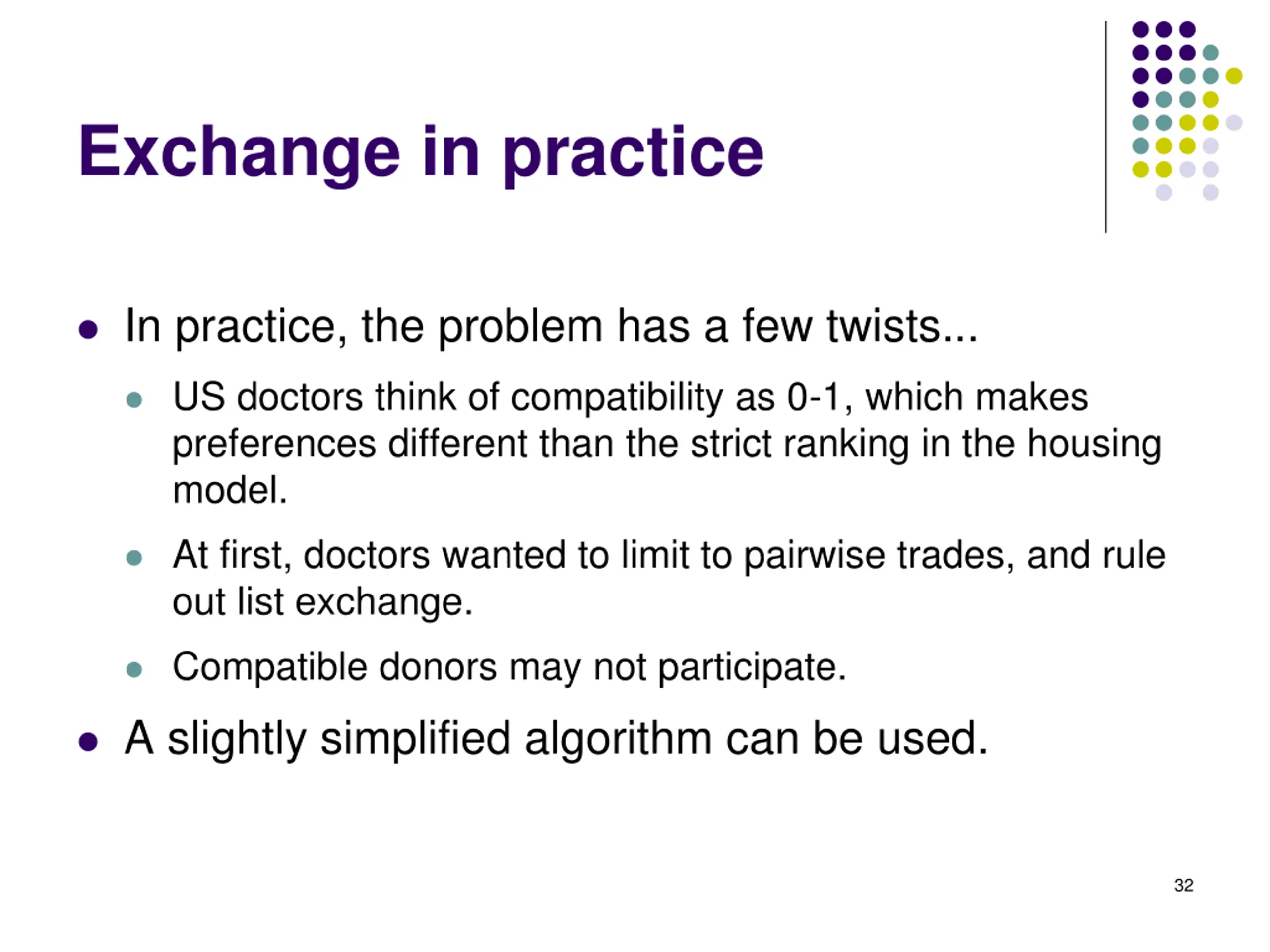Exchange in practice In practice, the problem has a few twists... US doctors think of compatibility as 0-1, which makes preferences different than the strict ranking in the housing model. At first, doctors wanted to limit to pairwise trades, and rule out list exchange. Compatible donors may not participate. A slightly simplified algorithm can be used. 32